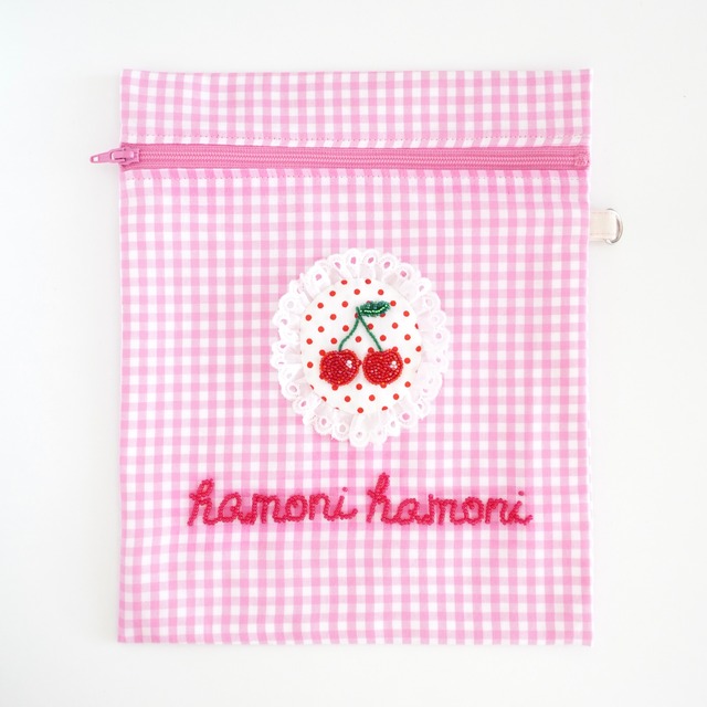 ーズ刺繍のさくらんぼとリボンのファスナーフラットポーチ(ピンクギンガムチェック)