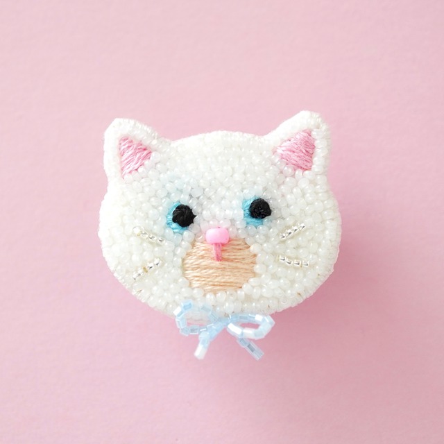 ねこちゃんブローチ(白猫) ビーズ刺繍