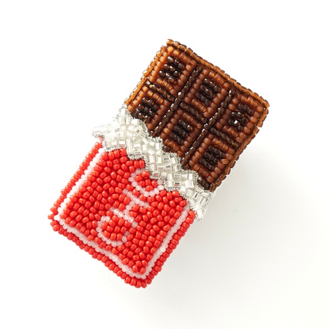 ビーズ刺繍で制作した板チョコのブローチです。 ブラウン、赤、シルバーの色合いがポップで楽しいデザインです。 六角ビーズやシャーロットビーズなど異なる種類のビーズを刺繍して、チョコレートの艶感や銀色の包み紙のキラキラとした質感を表現しました。 裏面には白色の合皮を使用し、丁寧に仕上げています。 ブローチピンは日本製の回転ピンを使用しています。針の先端を収納してロックできるため、誤って指を刺してしまったり、洋服にひっかけてしまう心配が少なく安全です。 ※配送の際はオーガンジーの巾着袋に入れた状態で段ボールに入れてお送りします。 ※プラス200円で箱とリボン掛けのラッピングを承ります。ご希望の方はオプション欄でご選択ください。 ーサイズー ・縦×横:約4.6×約2.9cm ・重さ:6g ー素材ー ・ビーズ ・合皮 ・ブローチ金具