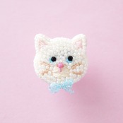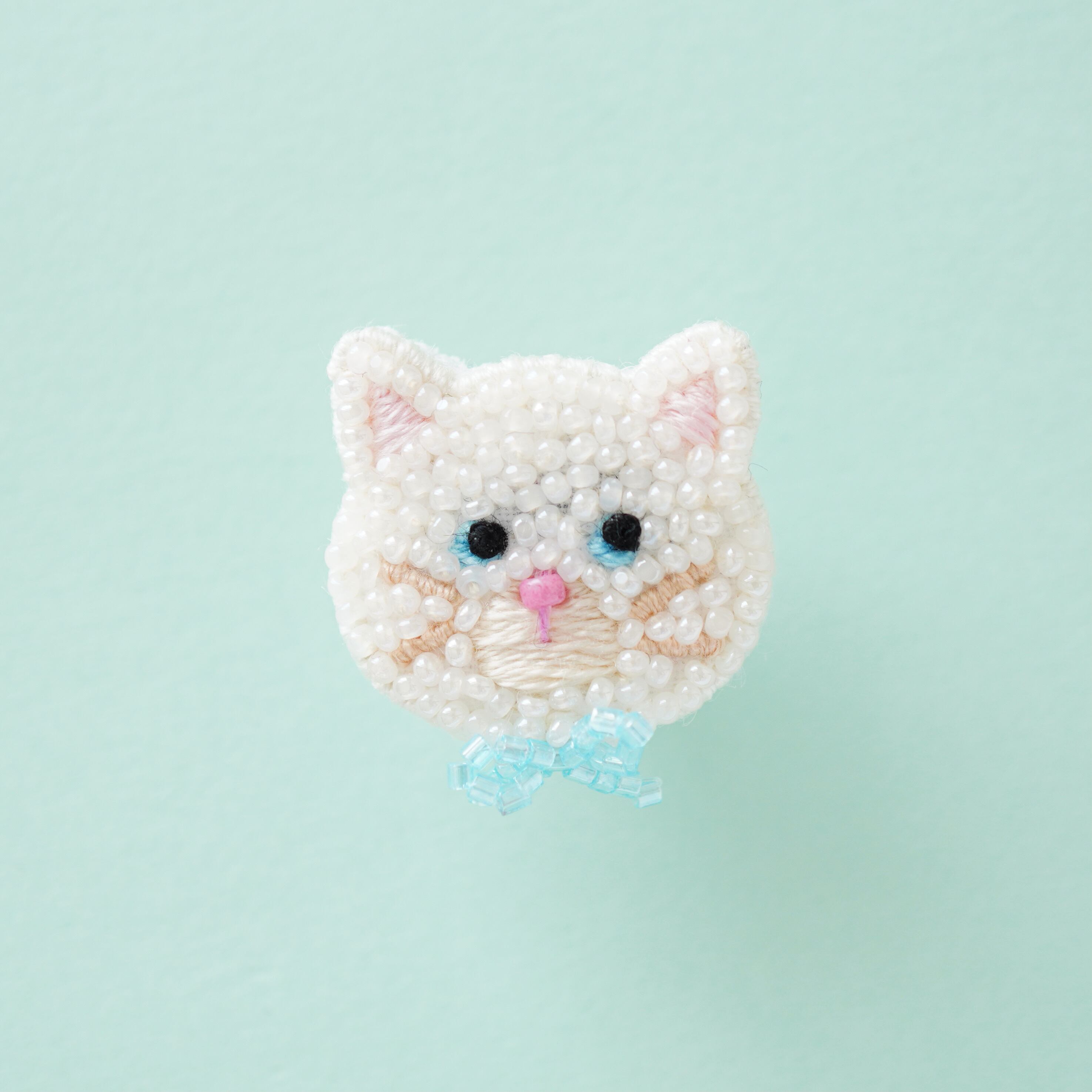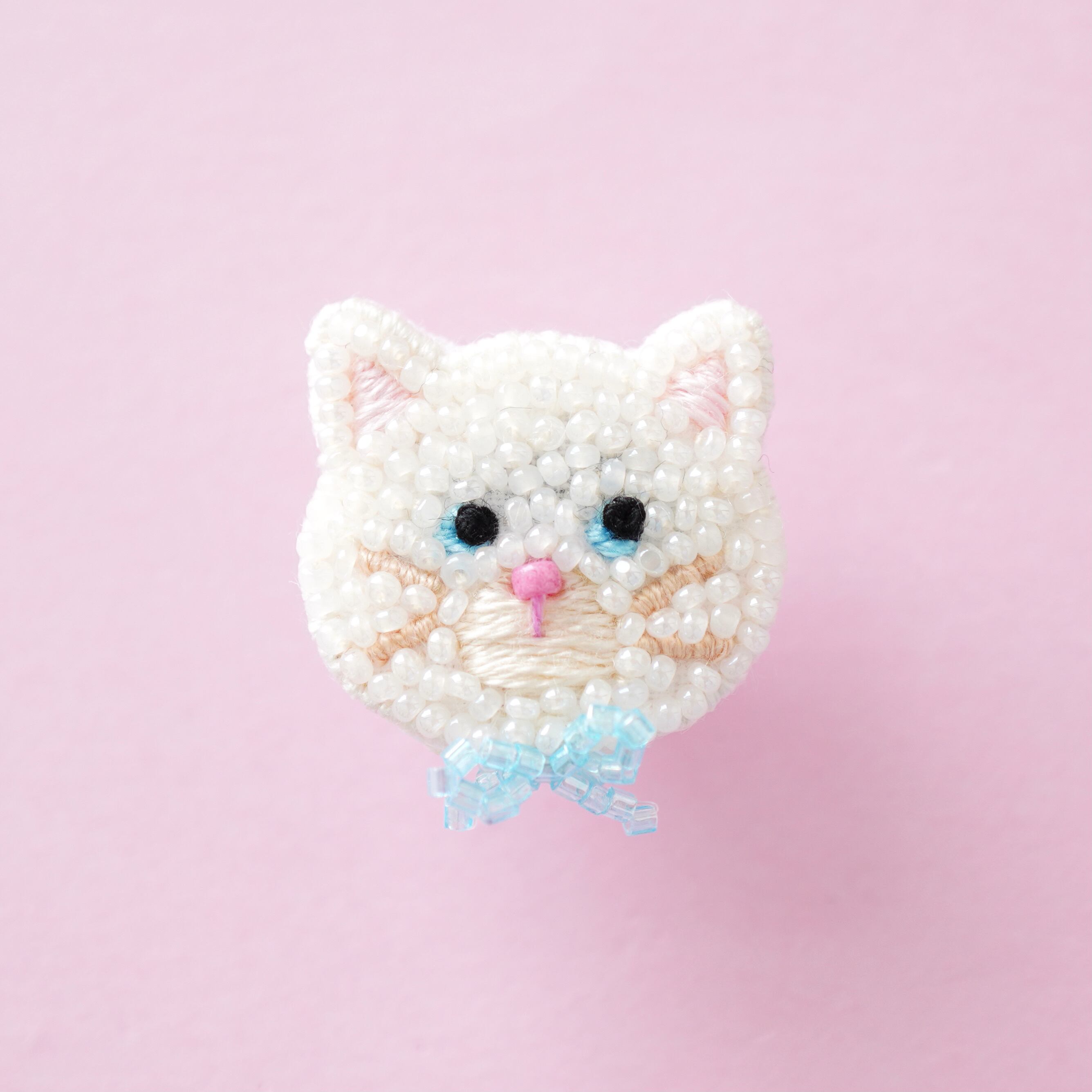 ねこちゃんピンバッジ(白猫) ビーズ刺繍ブローチ