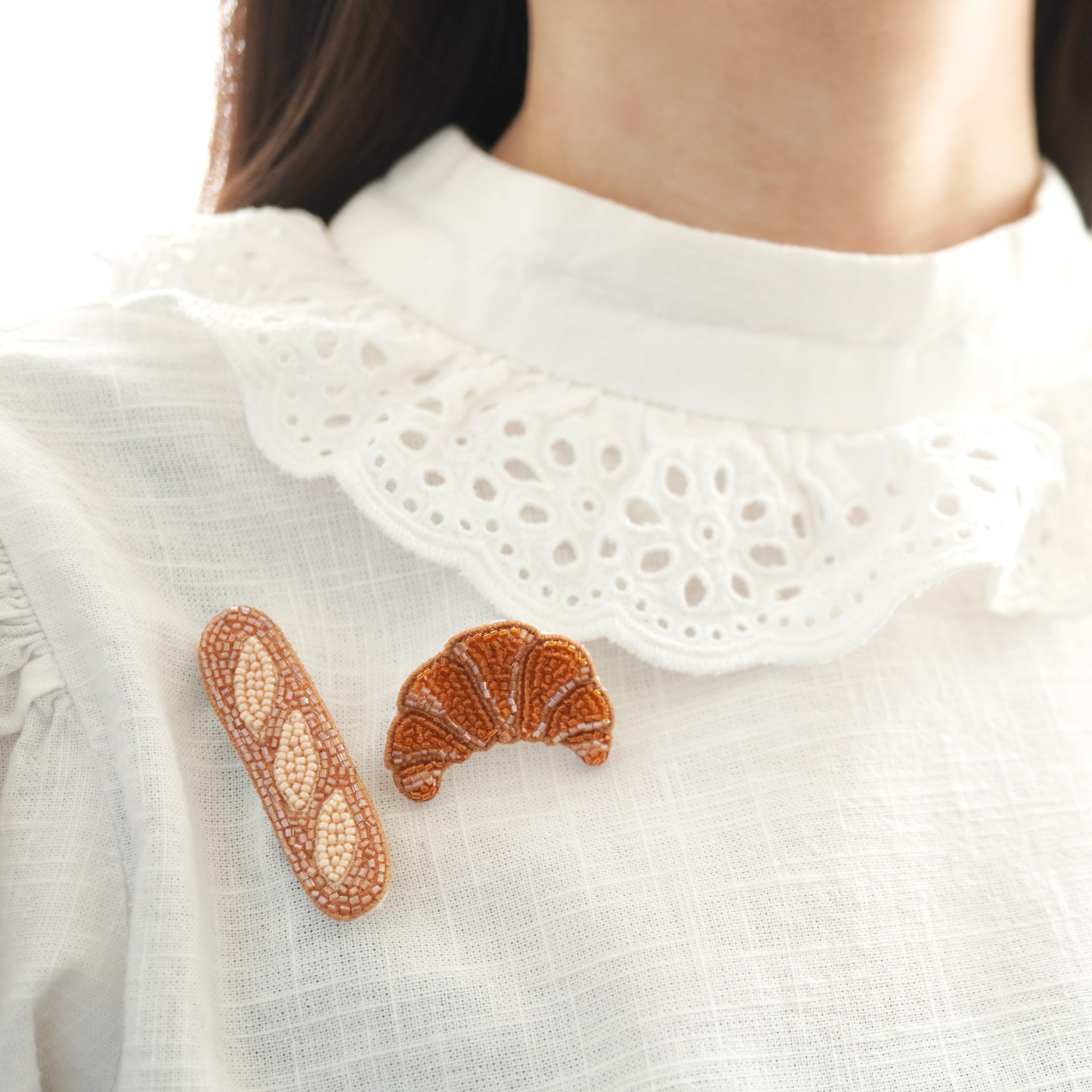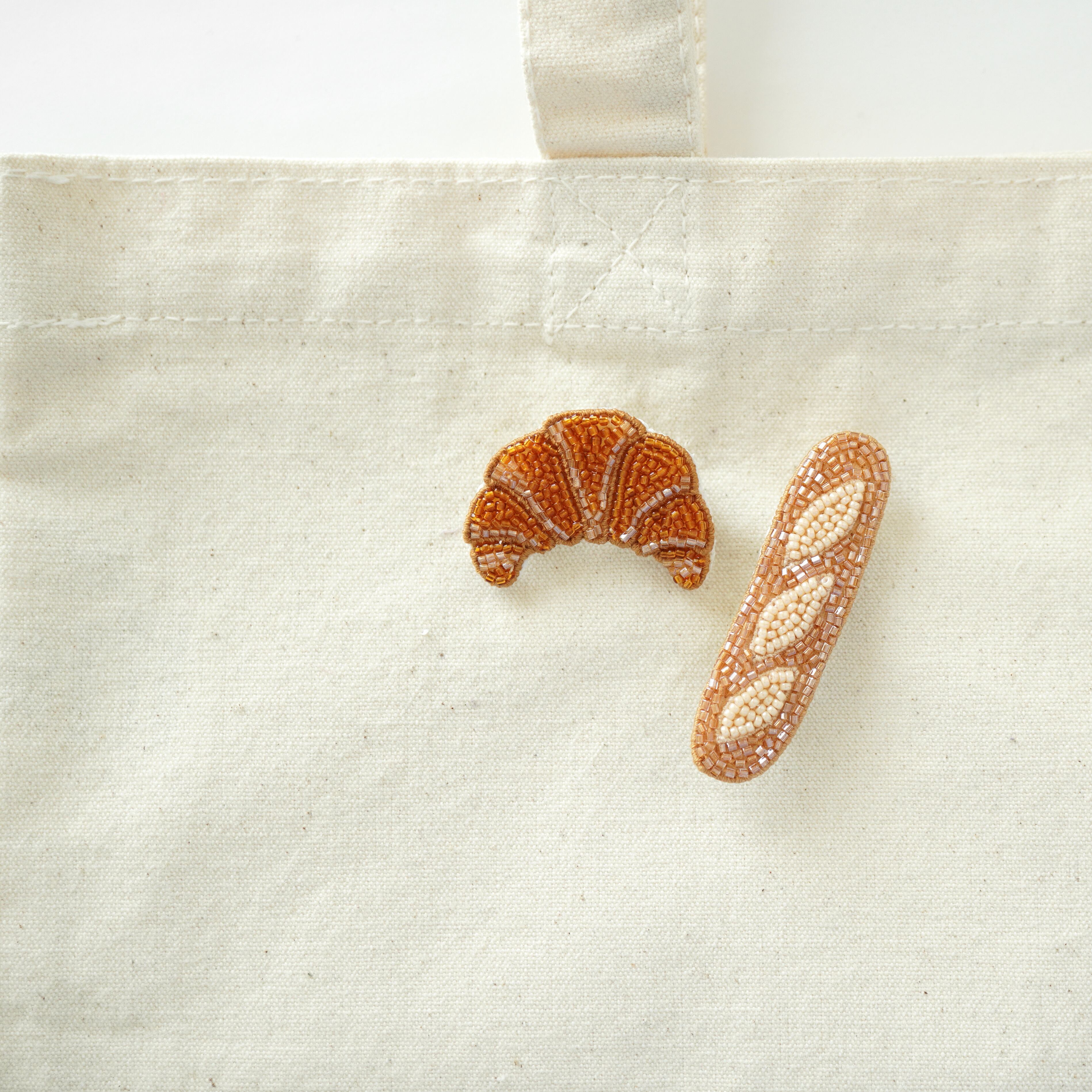 ビーズ刺繍で制作したクロワッサンのブローチとフランスパンのブローチ2点セットです。