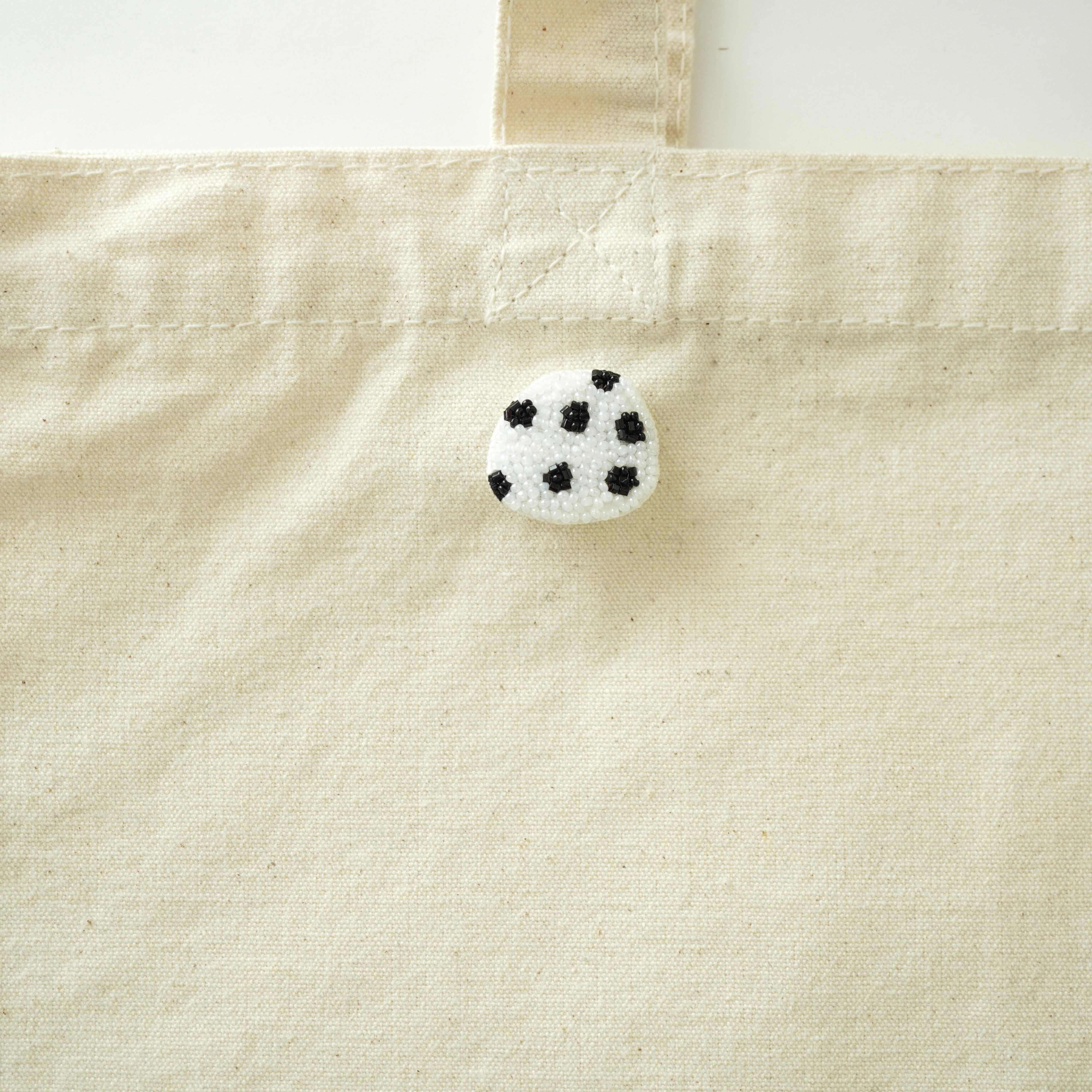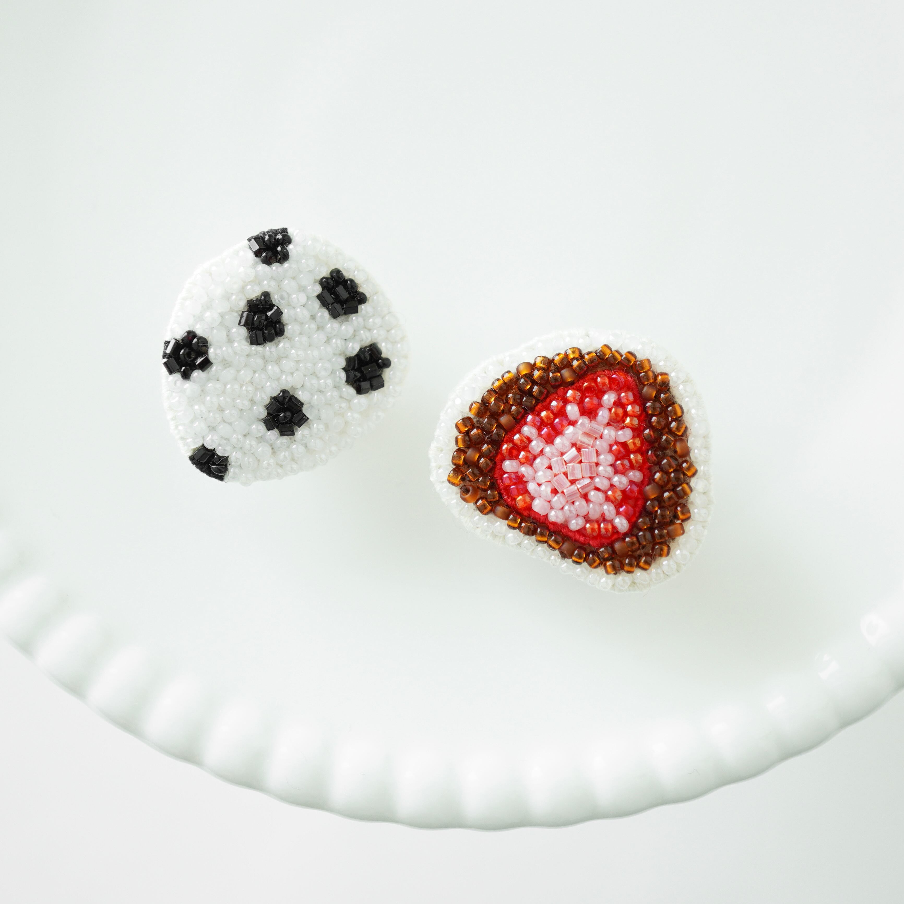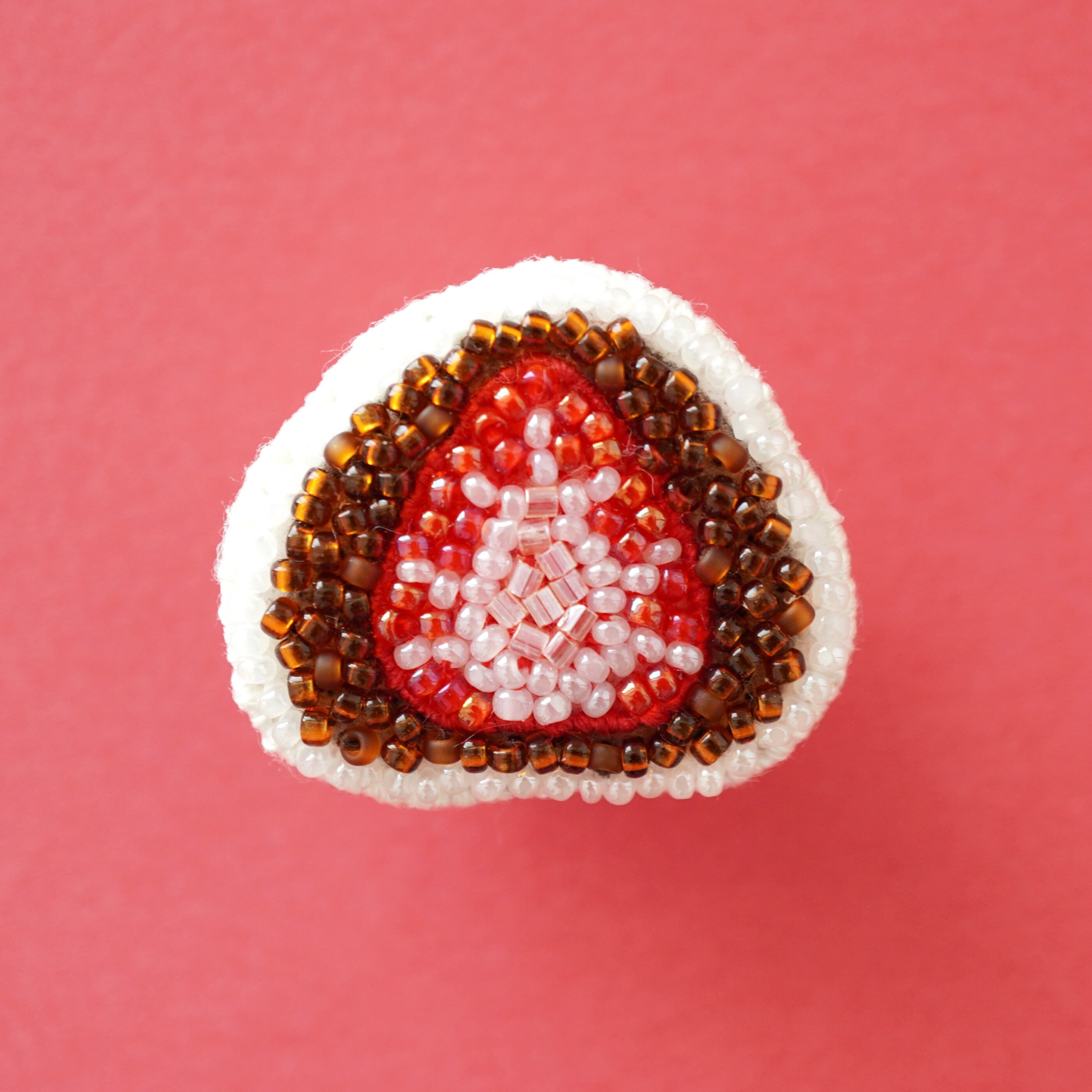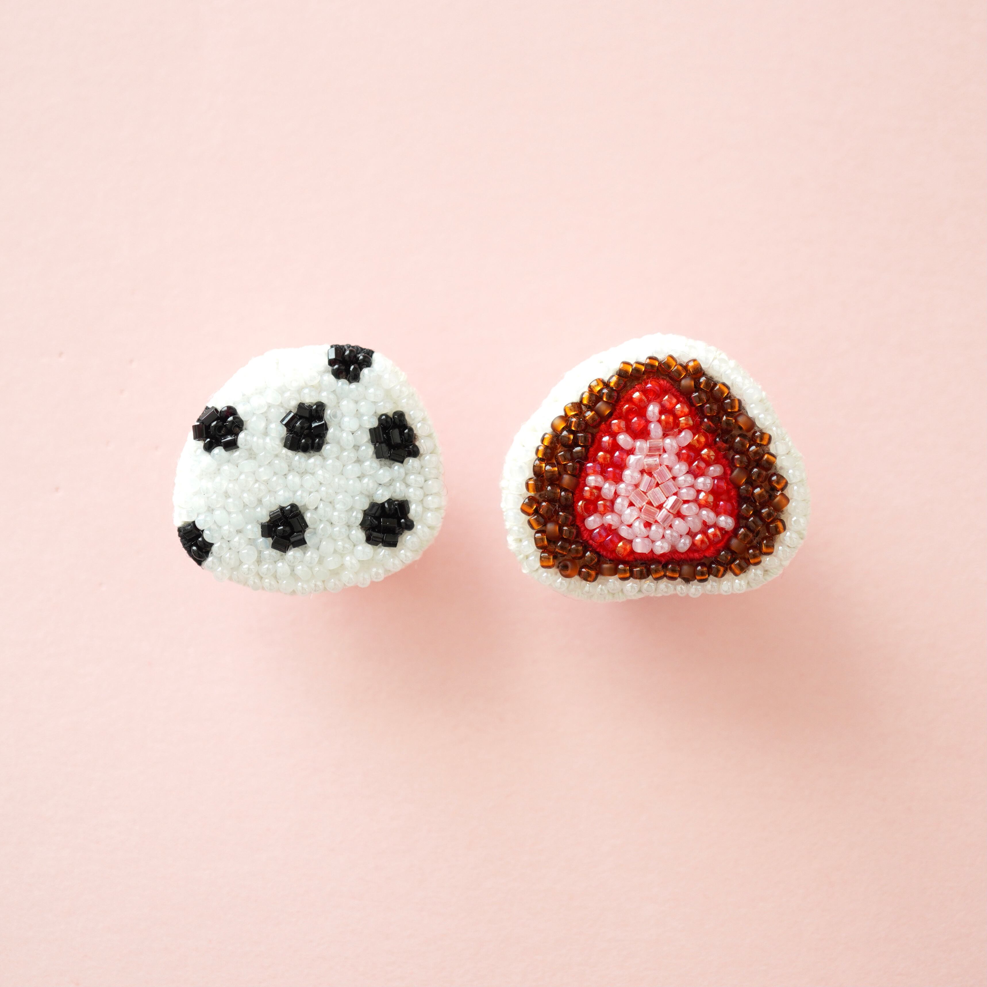 ビーズ刺繍で制作した豆大福と苺大福のピンバッジ2個セットです。