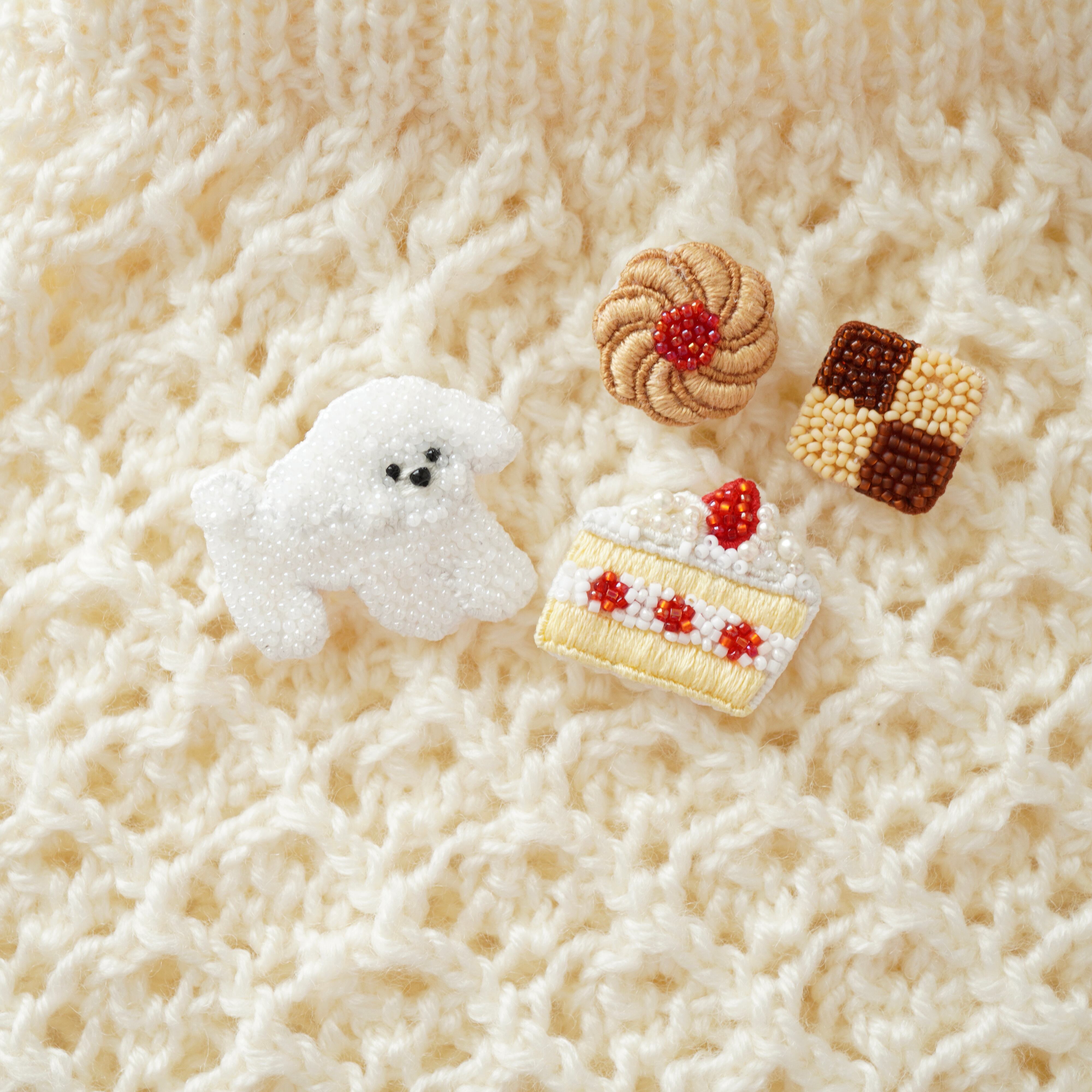 ビーズ刺繍で制作した白い犬のブローチです。