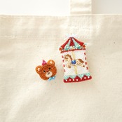 ビーズ刺繍で制作したメリーゴーランドのブローチと三角のパーティーハットをかぶったくまちゃんのピンバッジの2点セットです。