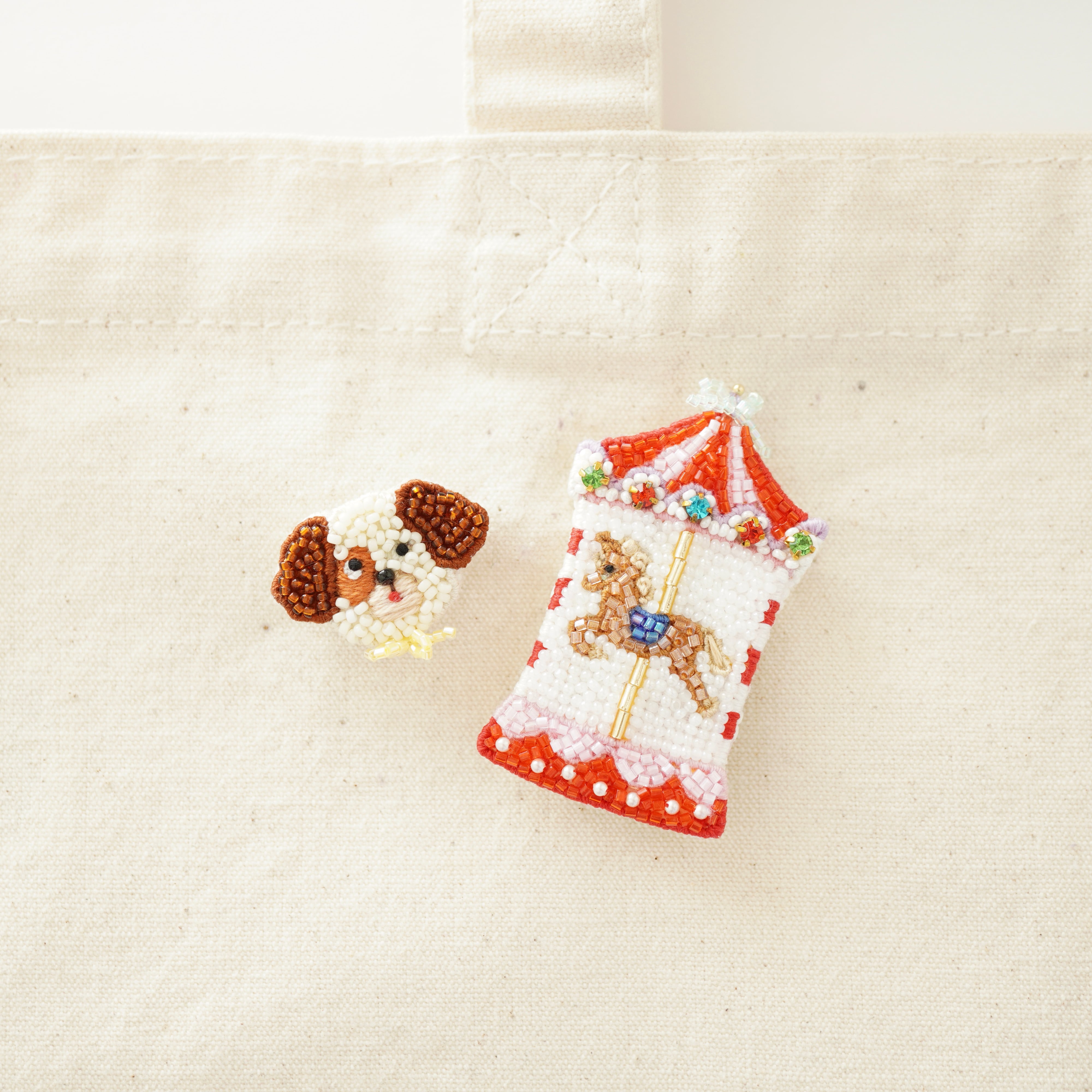 ビーズ刺繍で制作したメリーゴーランドのブローチと犬のピンバッジのセットです。