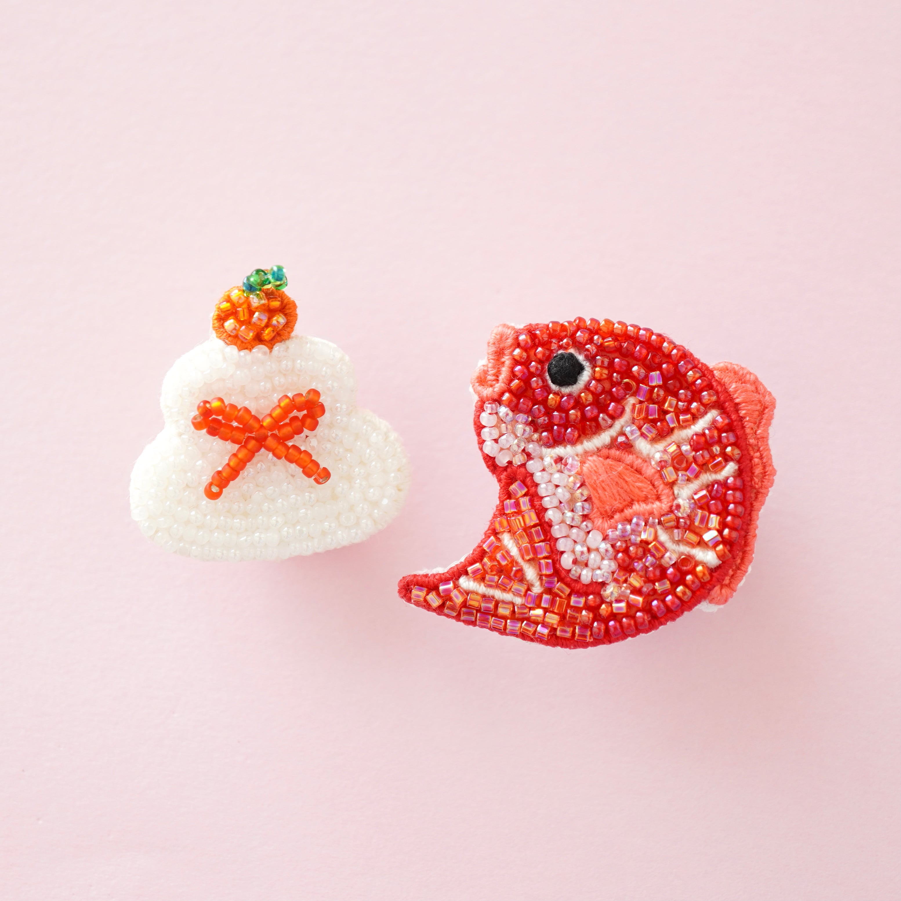 ビーズ刺繍で制作した鏡餅のピンバッジと鯛のブローチの2点セットです。