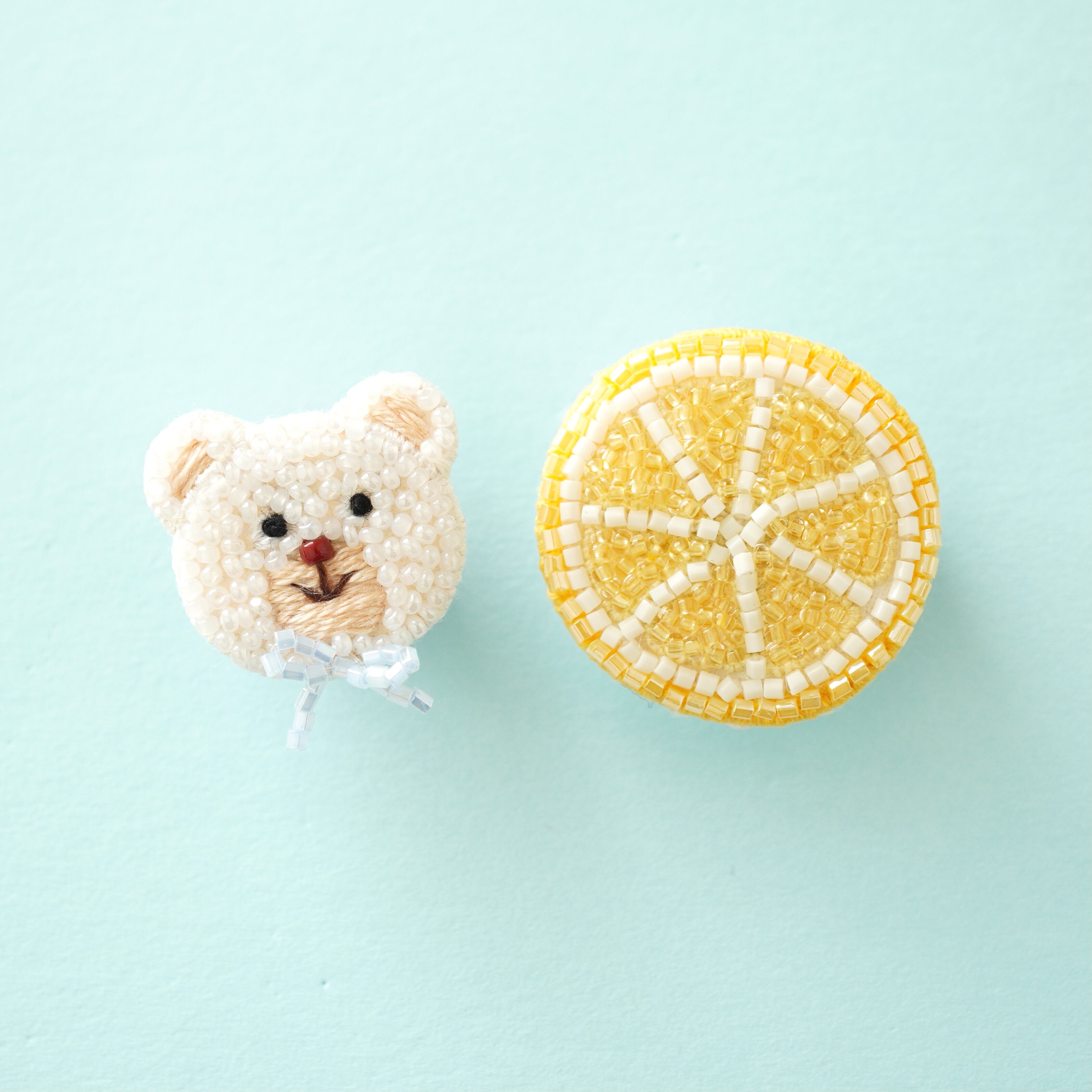 ビーズ刺繍で制作したレモンのブローチと白くまのピンバッジの2点セットです。