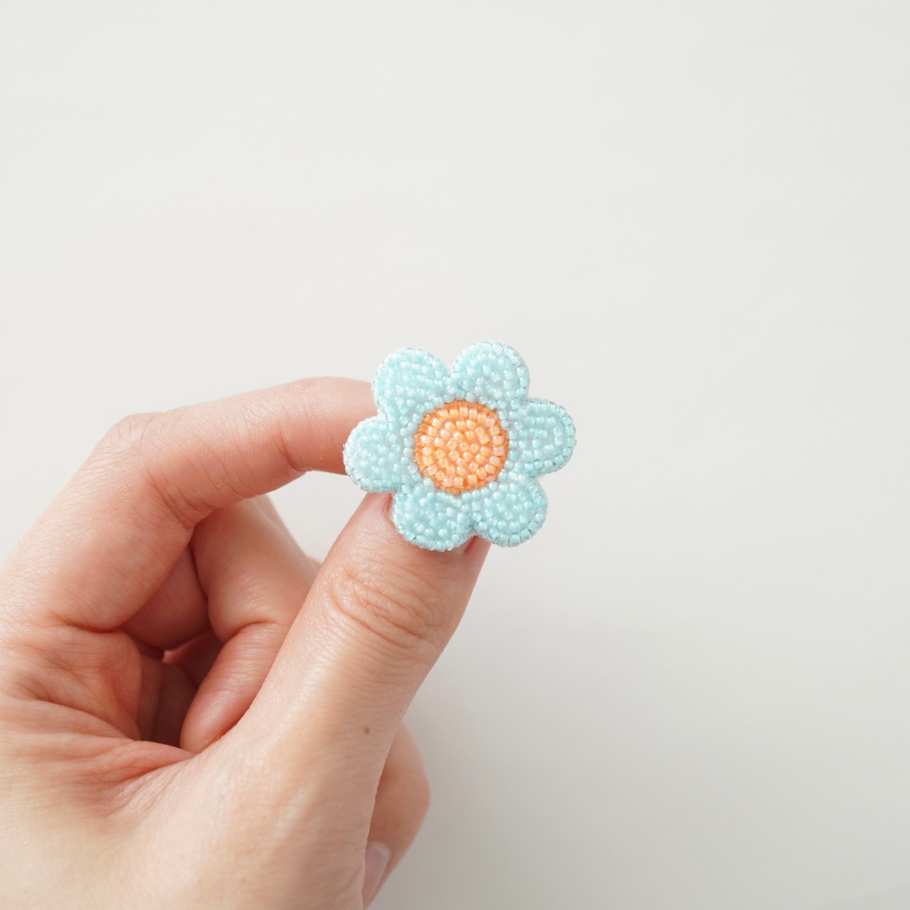水色とオレンジのビーズと丸い花びらのデザインがポップなデザインです。