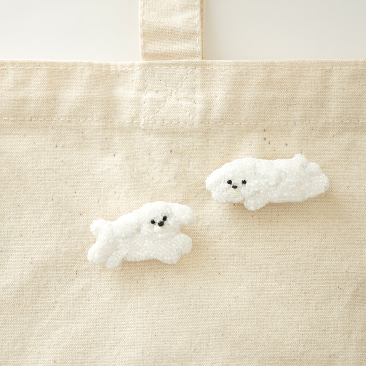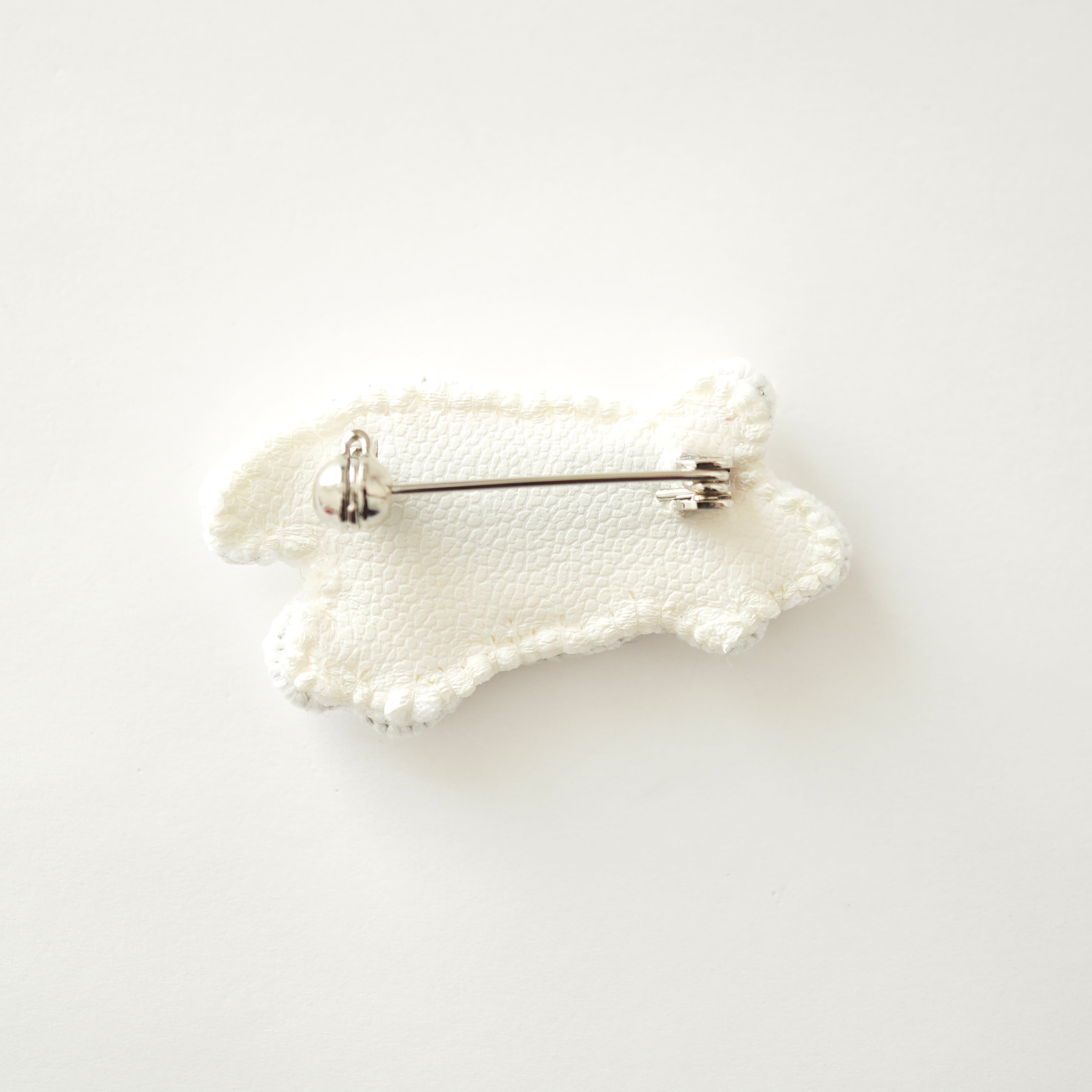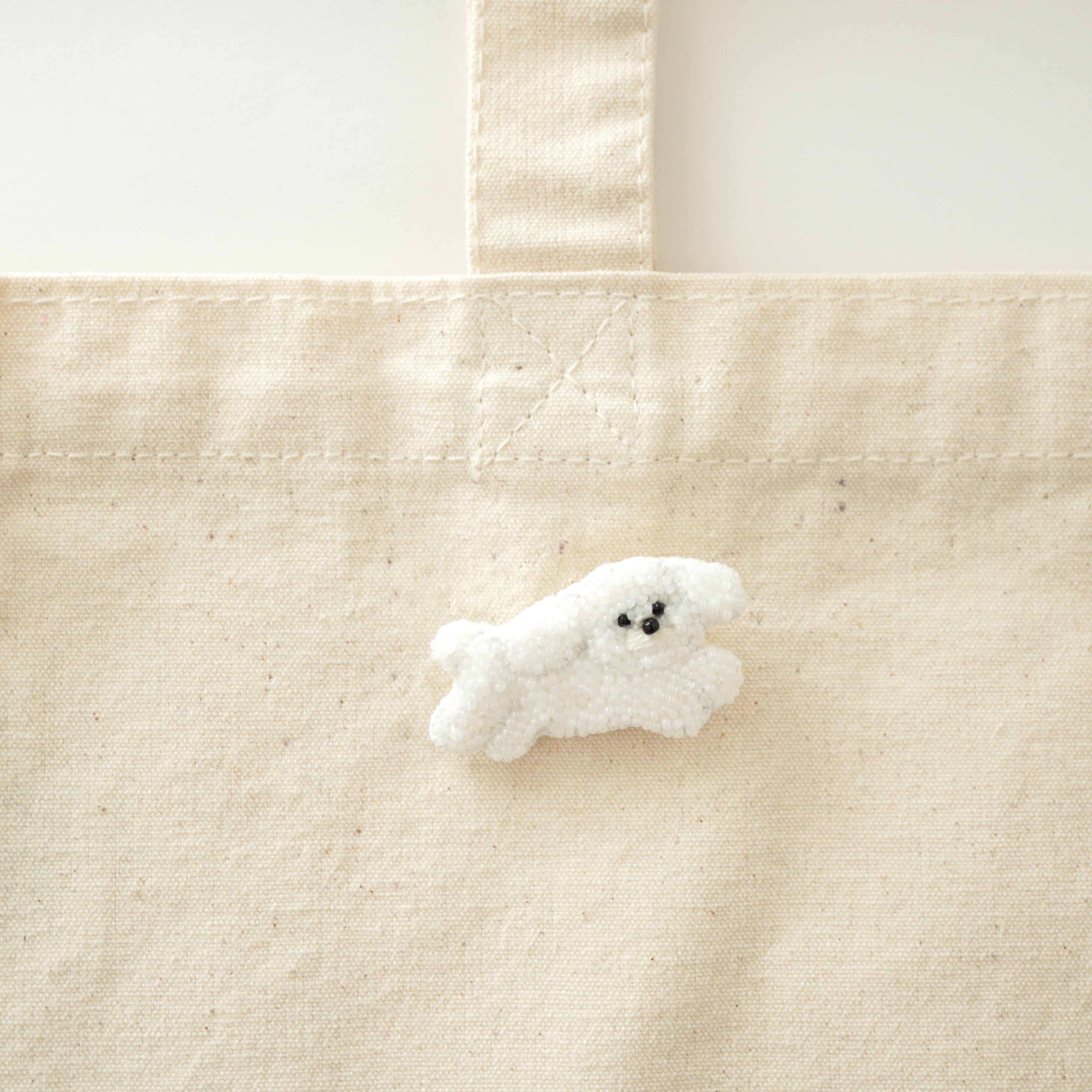ビーズ刺繍で制作した白い犬のブローチです。