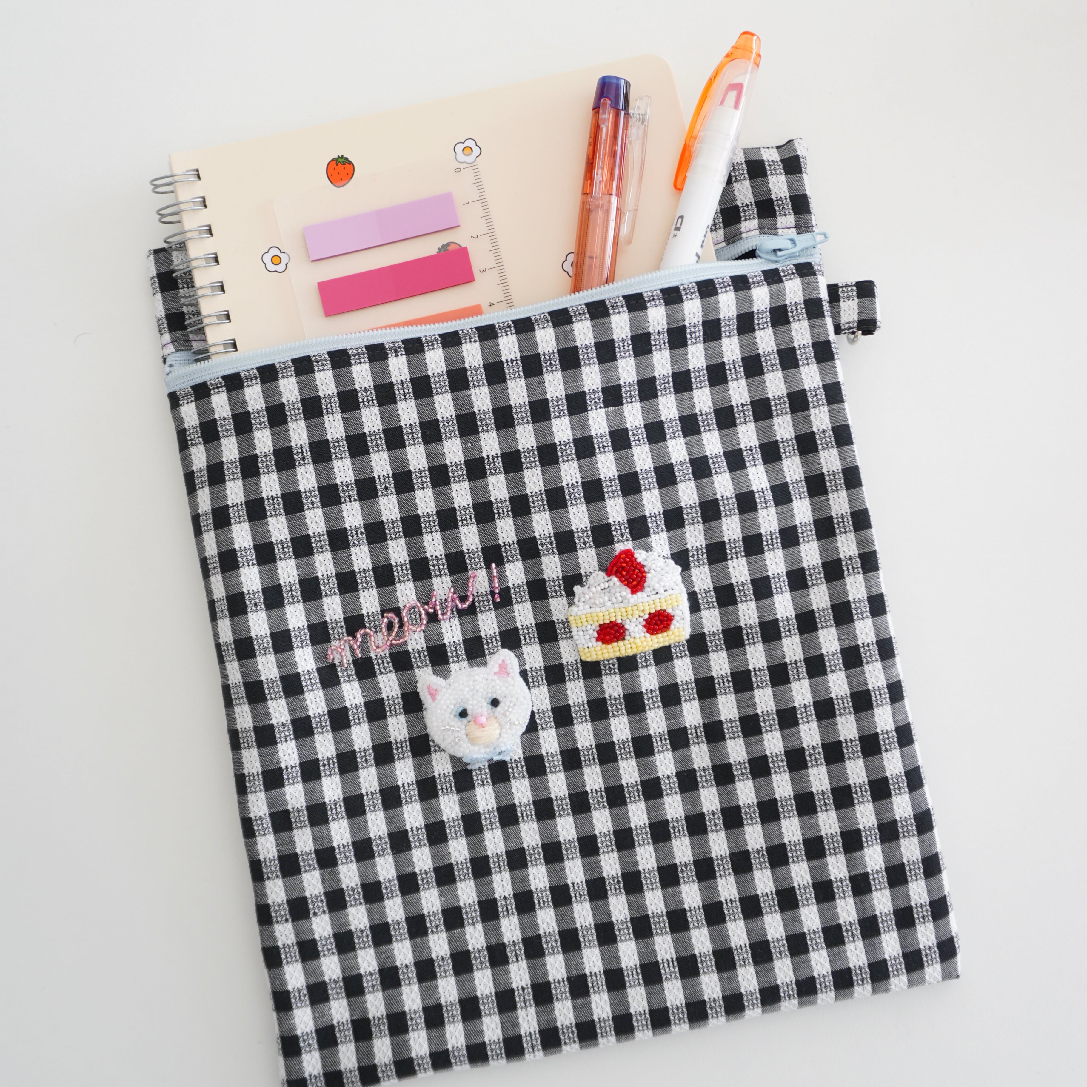 ビーズ刺繍の猫とショーケーキのファスナーフラットポーチ(白黒ギンガムチェック)