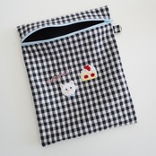 白黒のギンガムチェックにポップなモチーフのビーズ刺繍が映える可愛いデザインです。