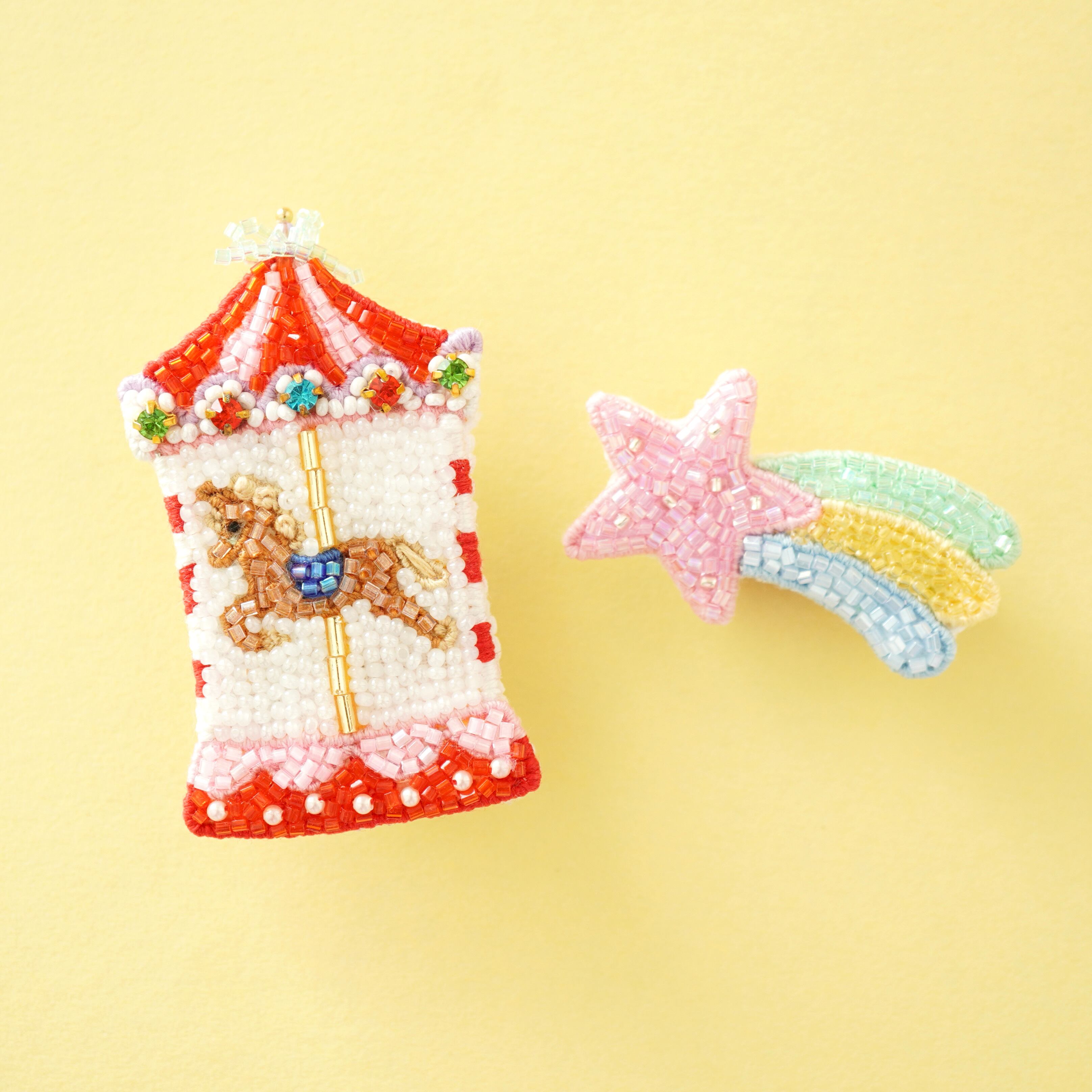 ビーズ刺繍で制作したメリーゴーランドのブローチと流れ星のブローチのセットです。