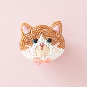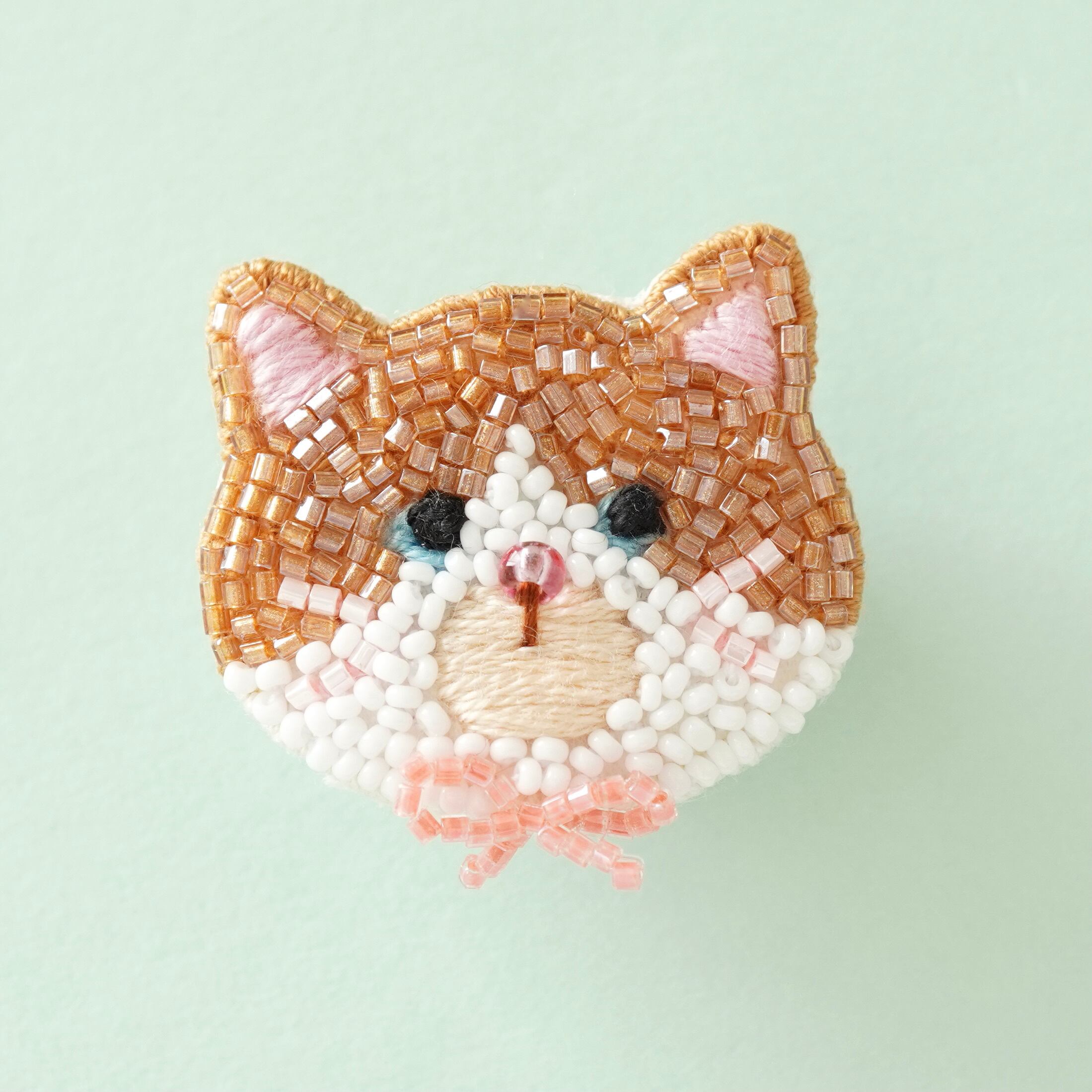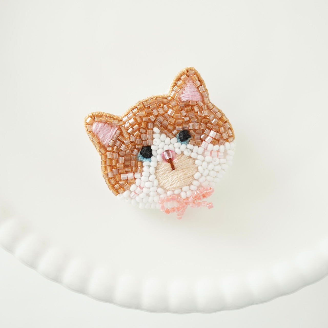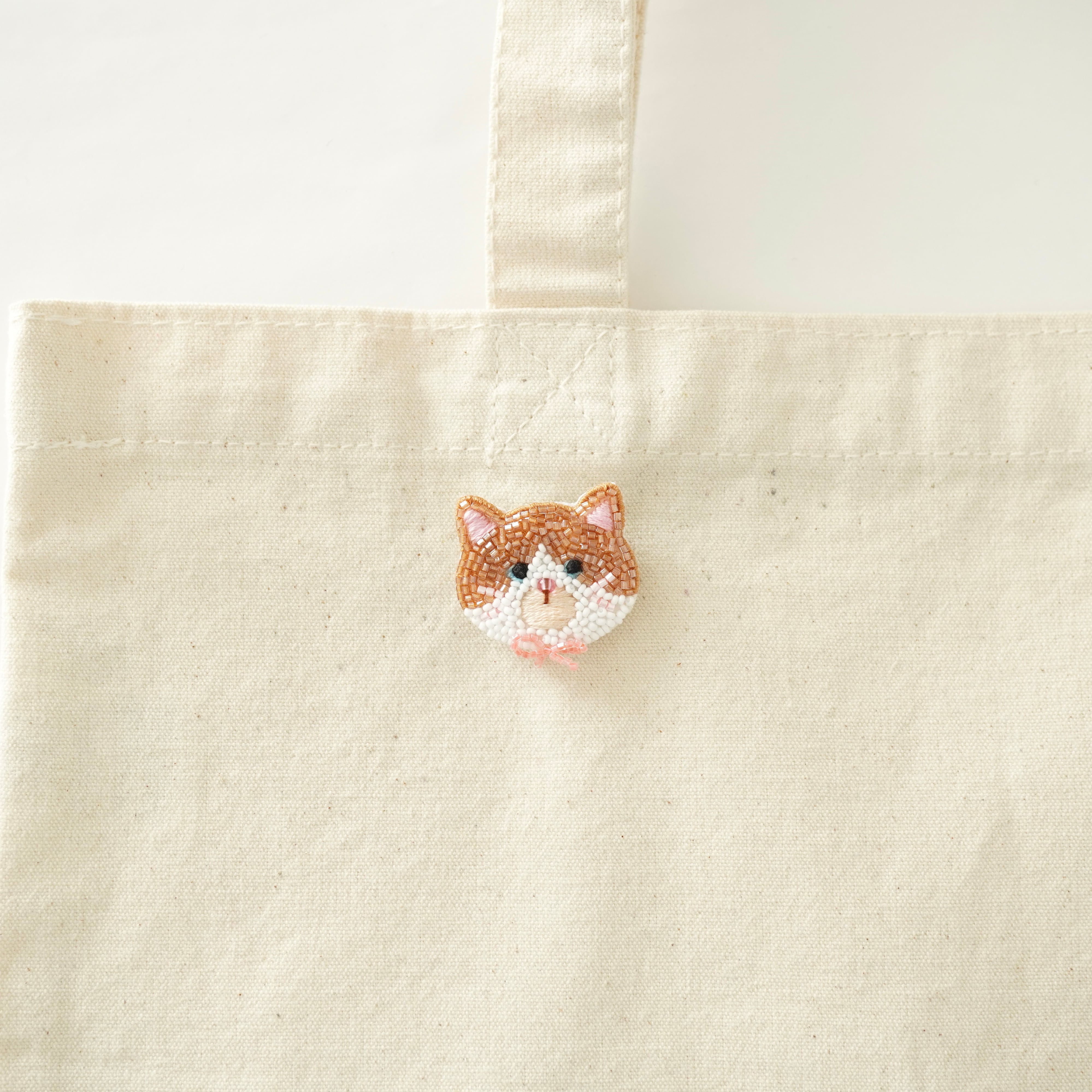 ねこちゃんブローチ(茶色×白) ビーズ刺繍