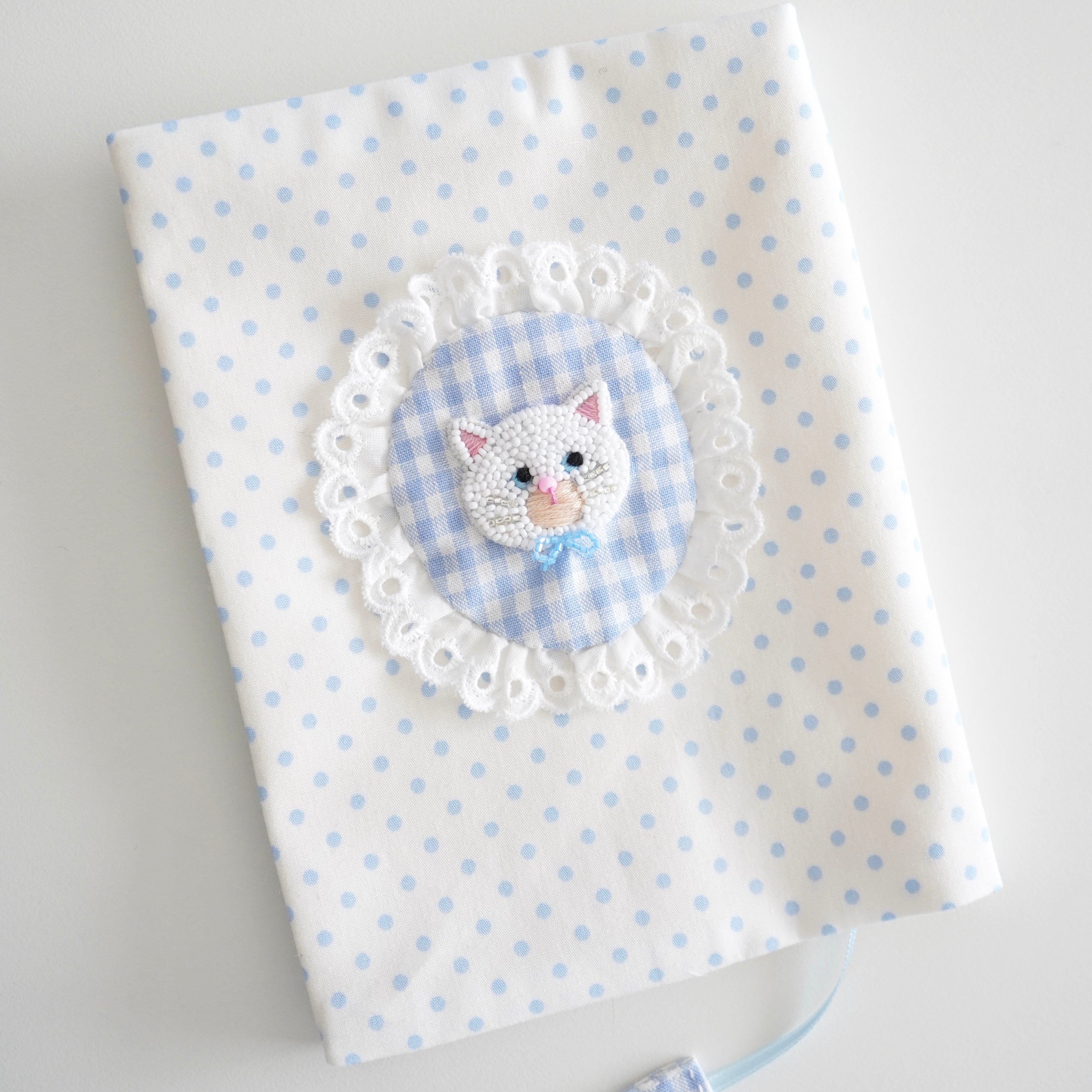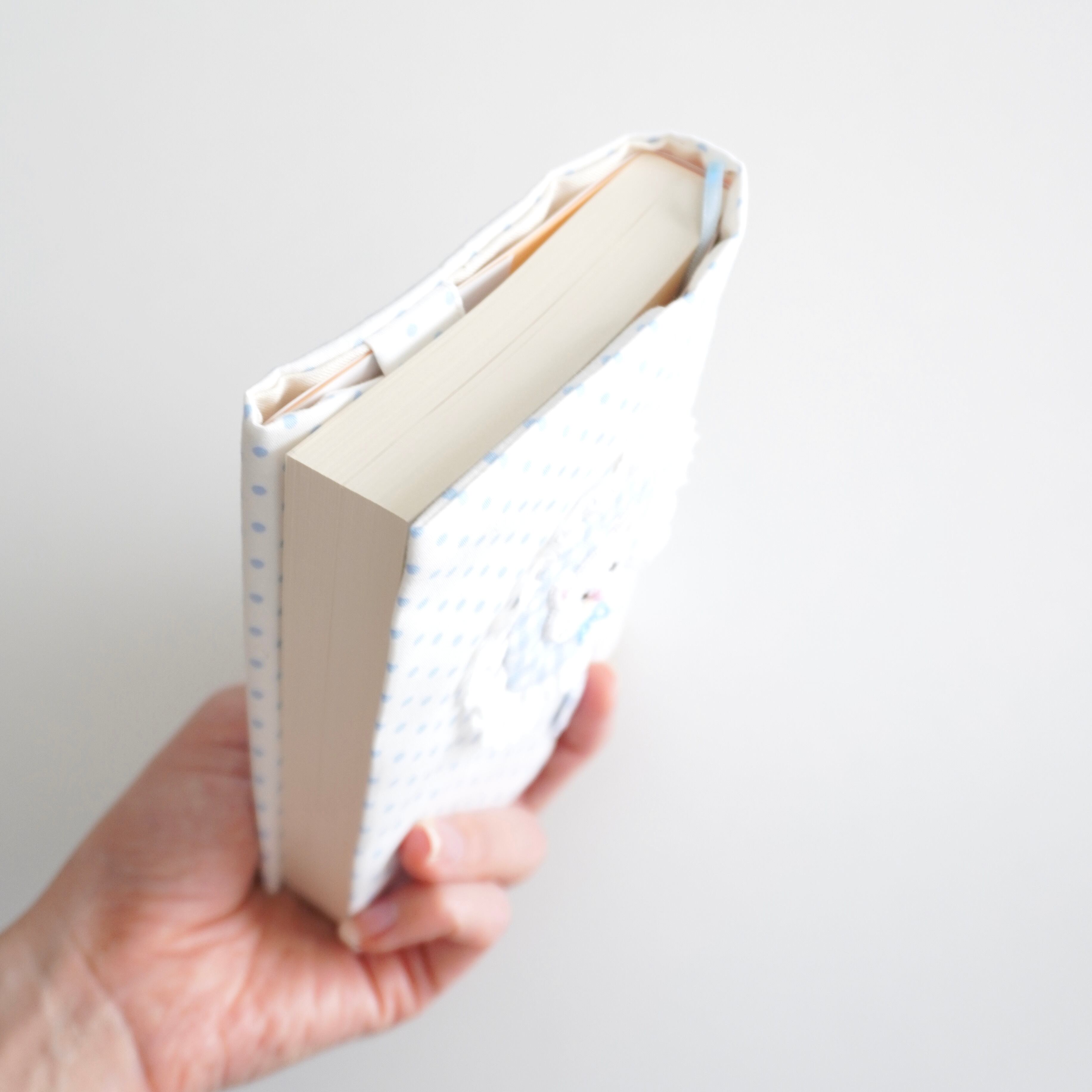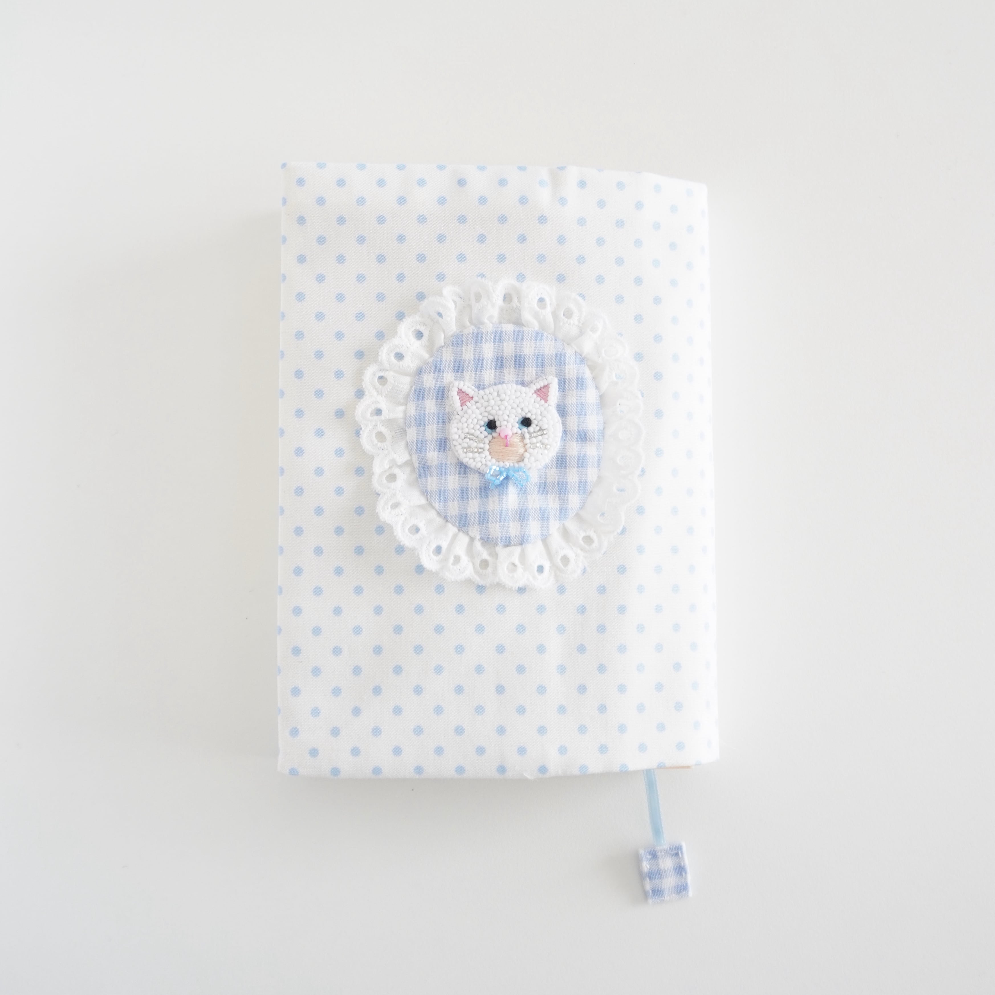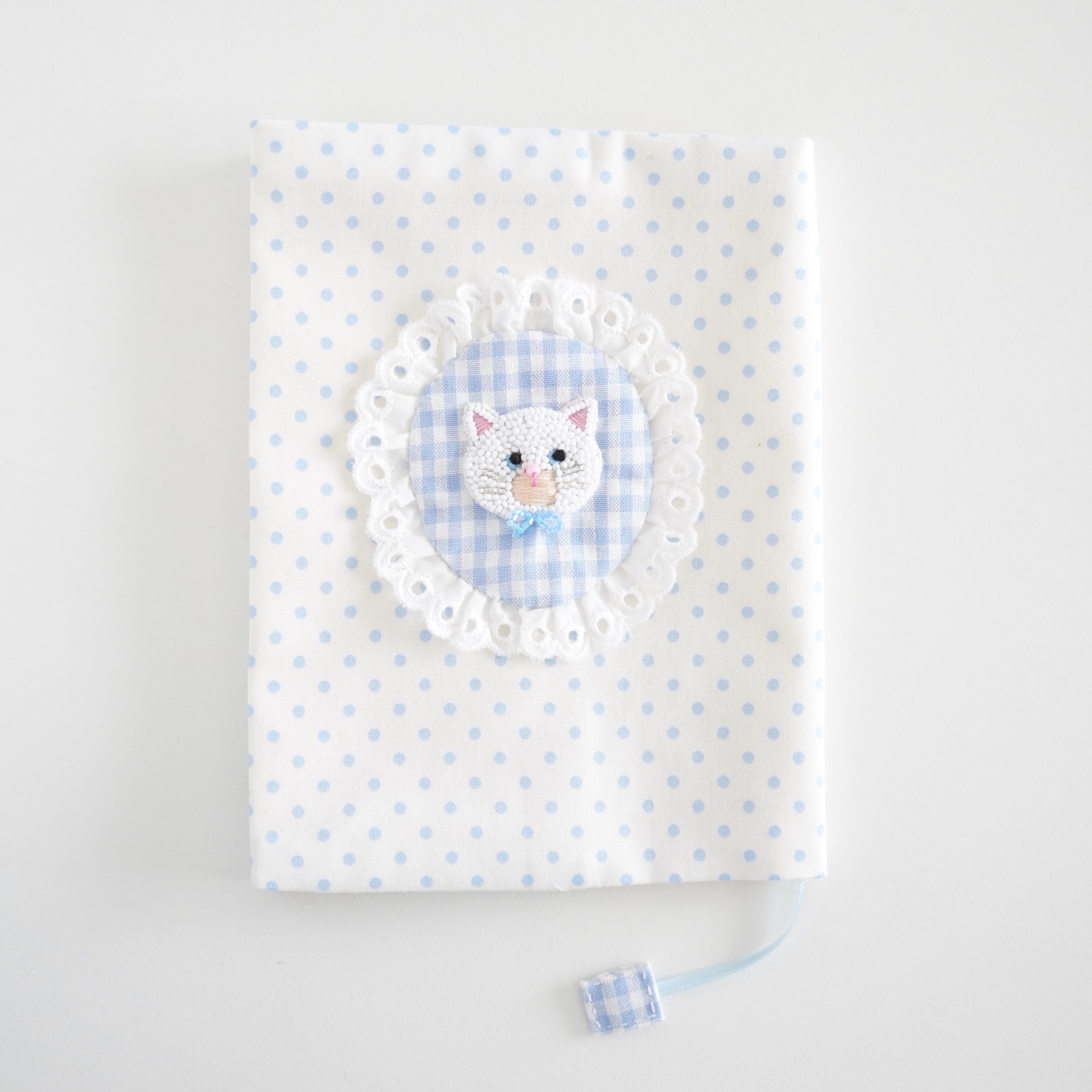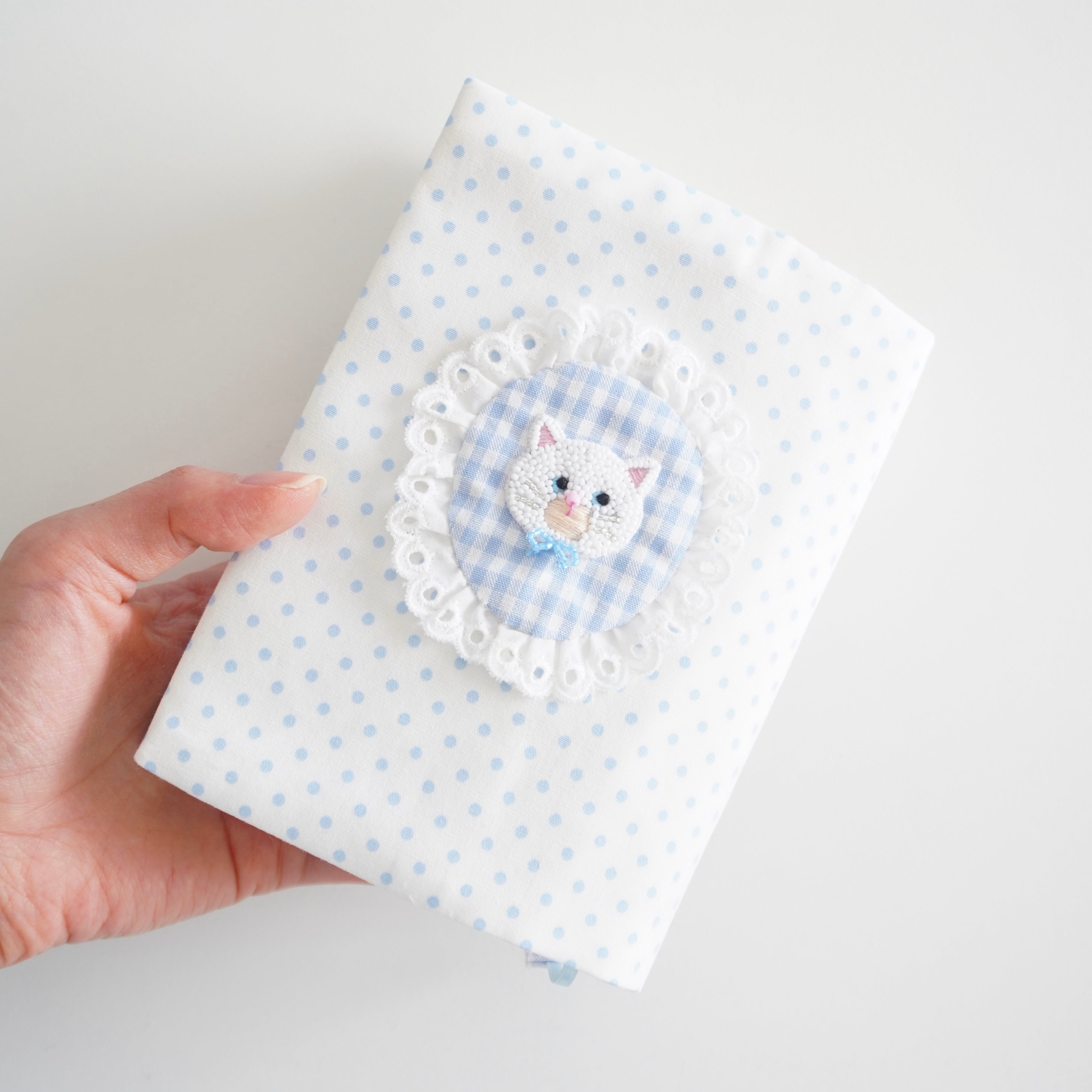 ビーズで白猫のデザインを刺繍した生地をアップリケした文庫本サイズのブックカバーです。