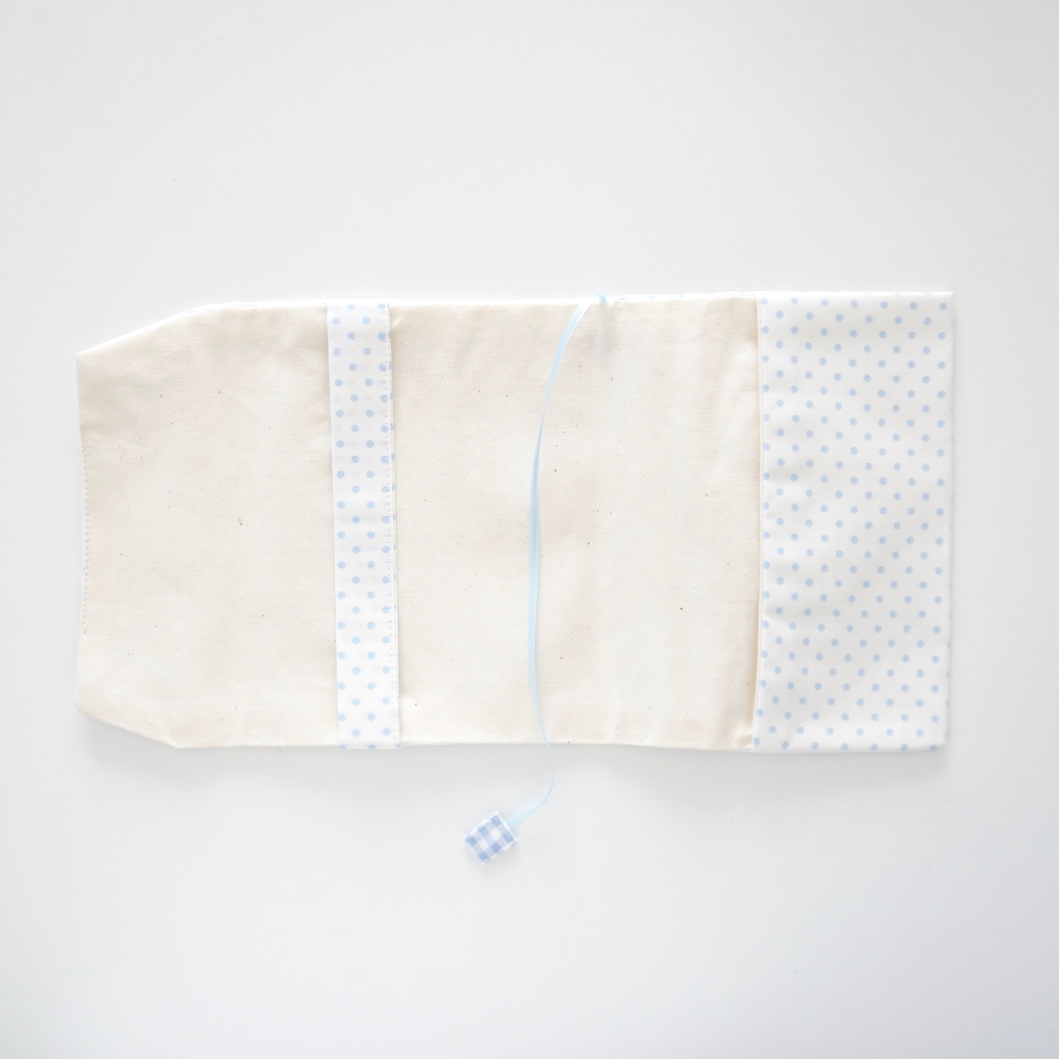 白と水色のドットとギンガムチェックの生地を組み合わせたふんわりとした色合いが可愛いデザインになっています。