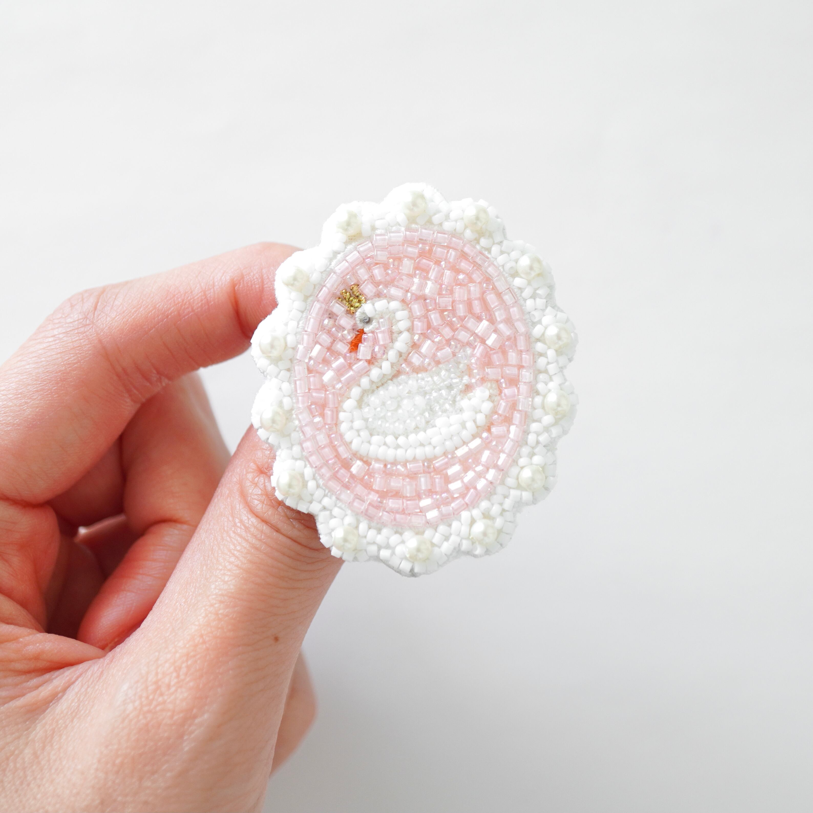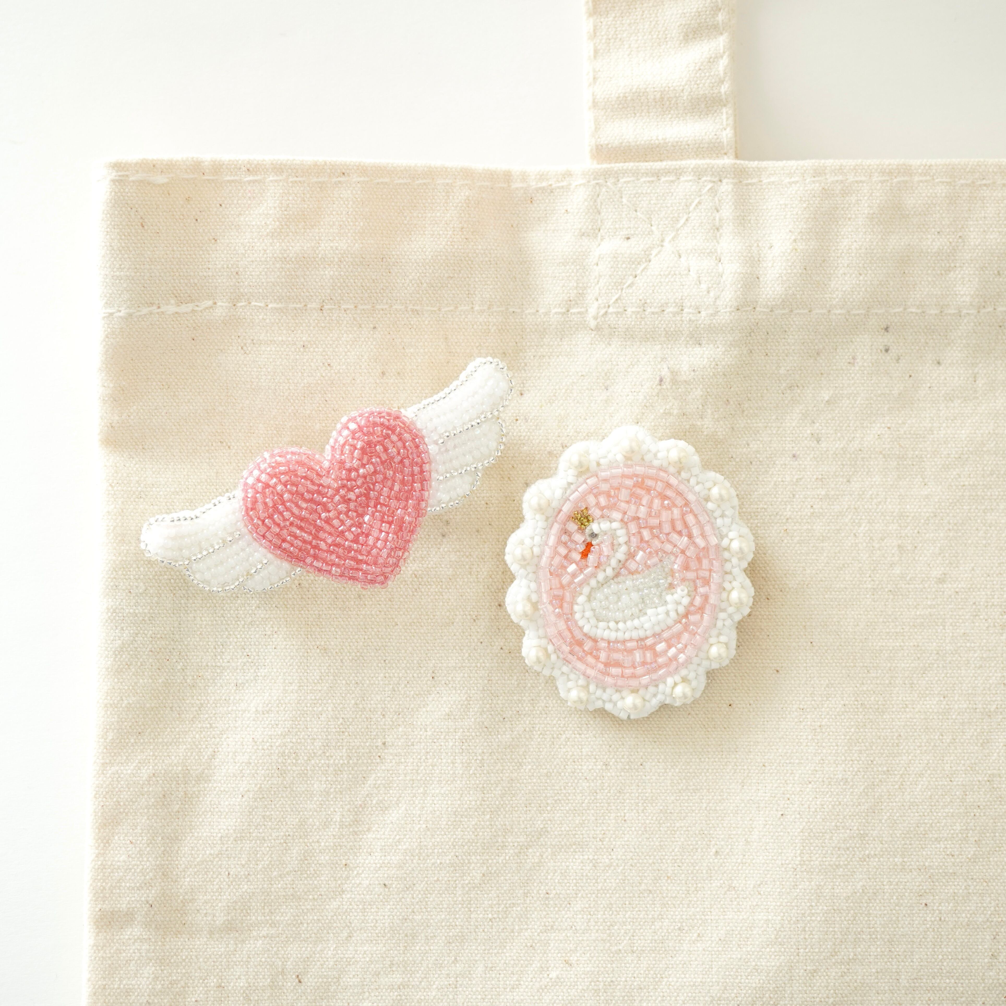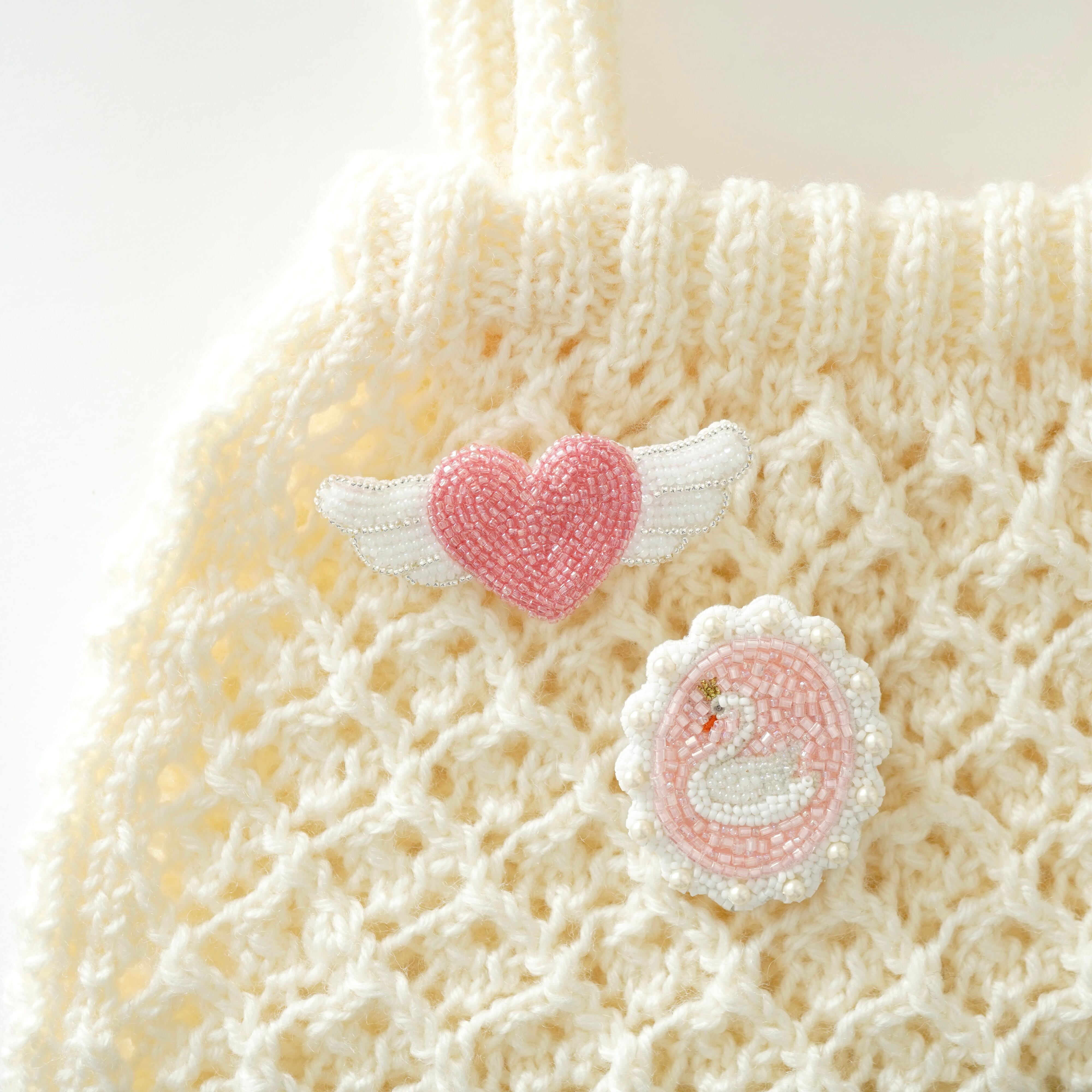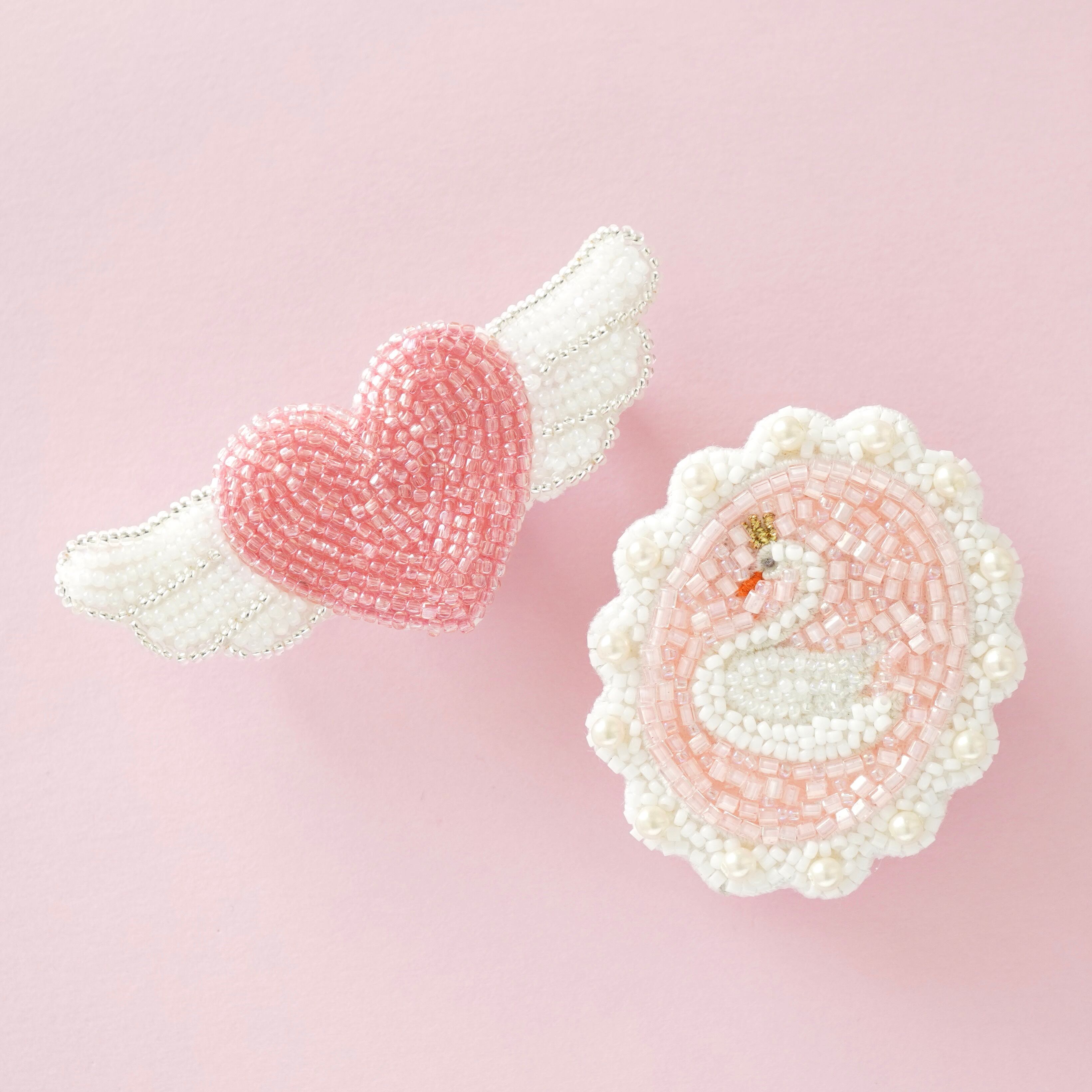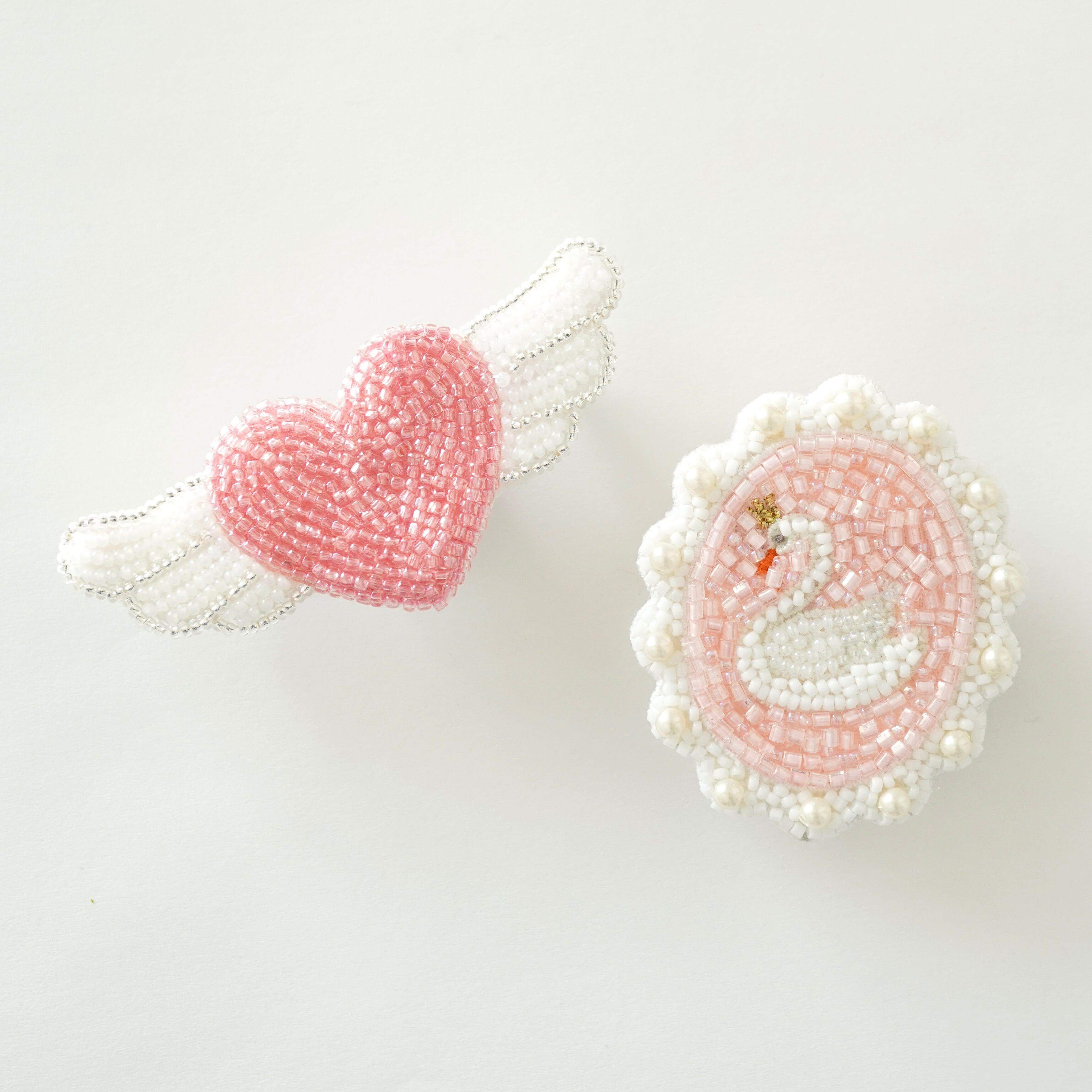 ビーズ刺繍で制作した白鳥のブローチとピンクのエンジェルハートブローチ2点セットです。