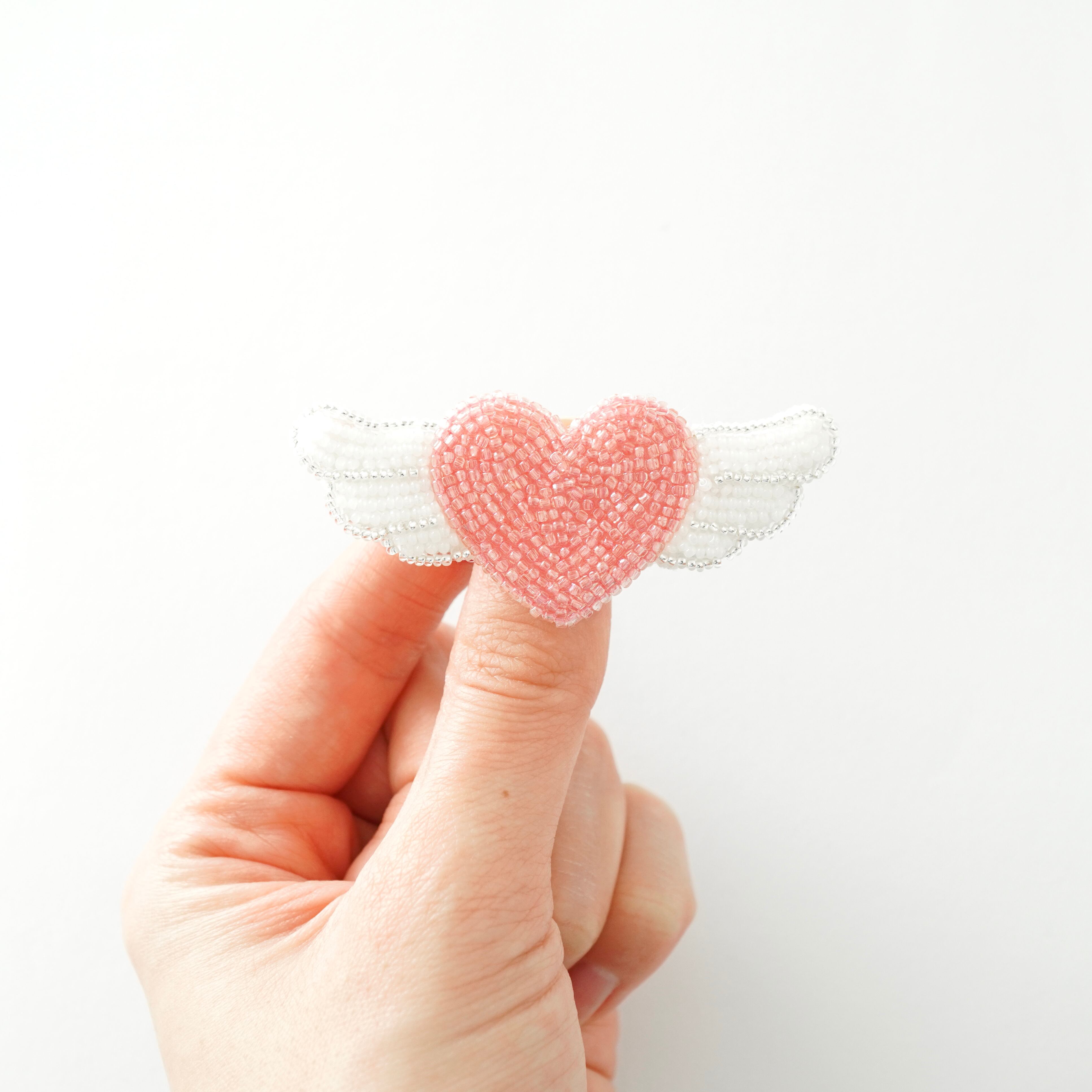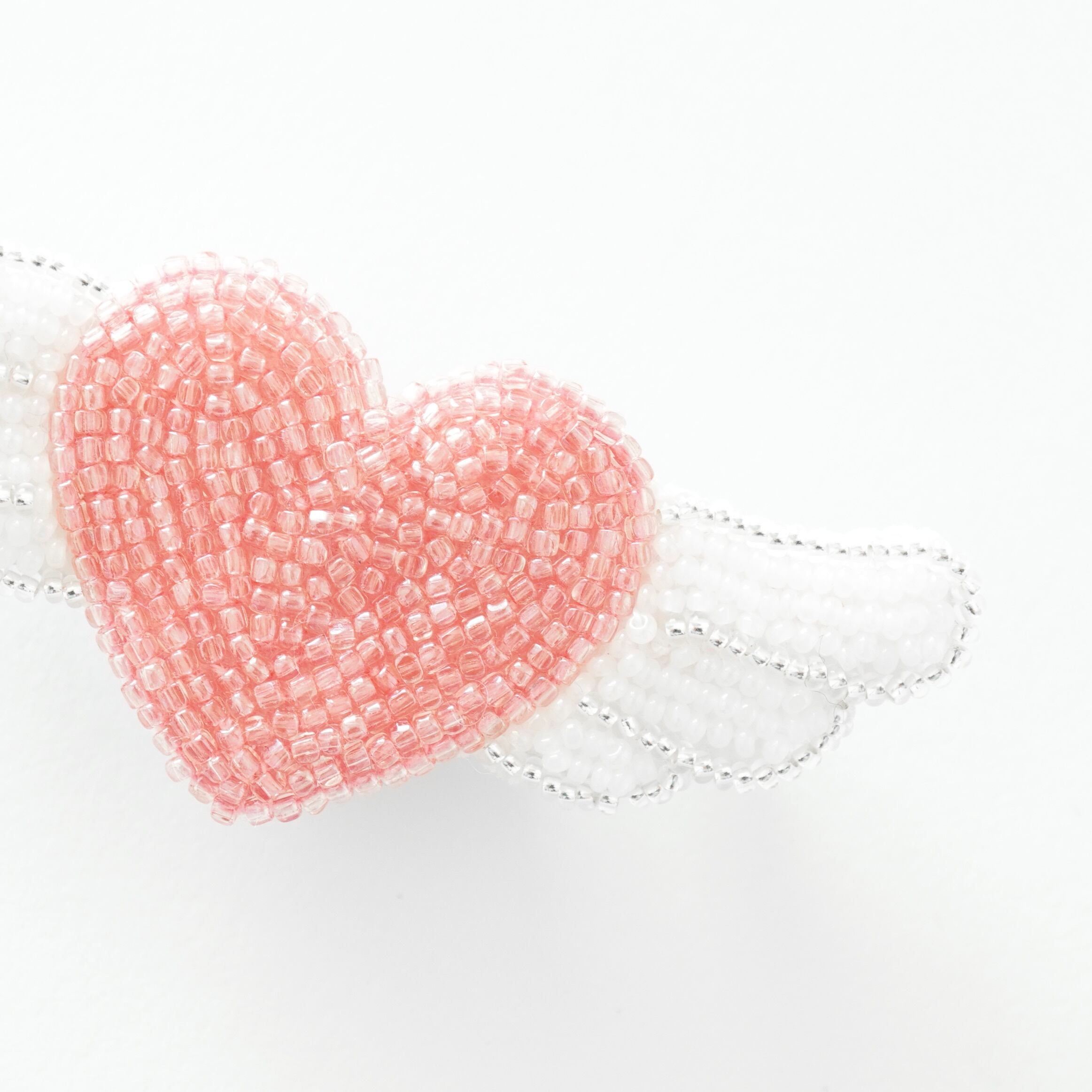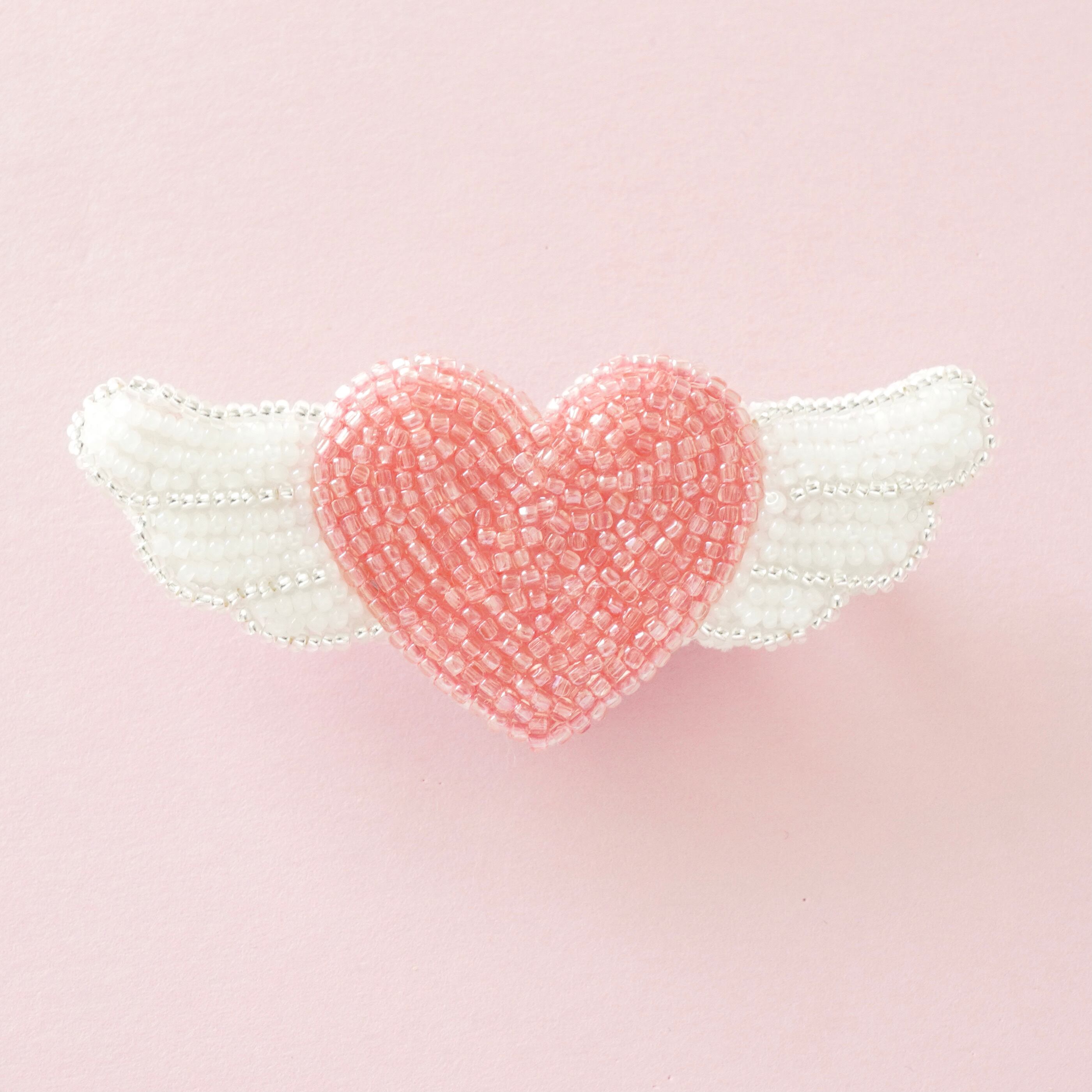 ビーズ刺繍で制作した天使の羽のついたピンクのハートのブローチです。