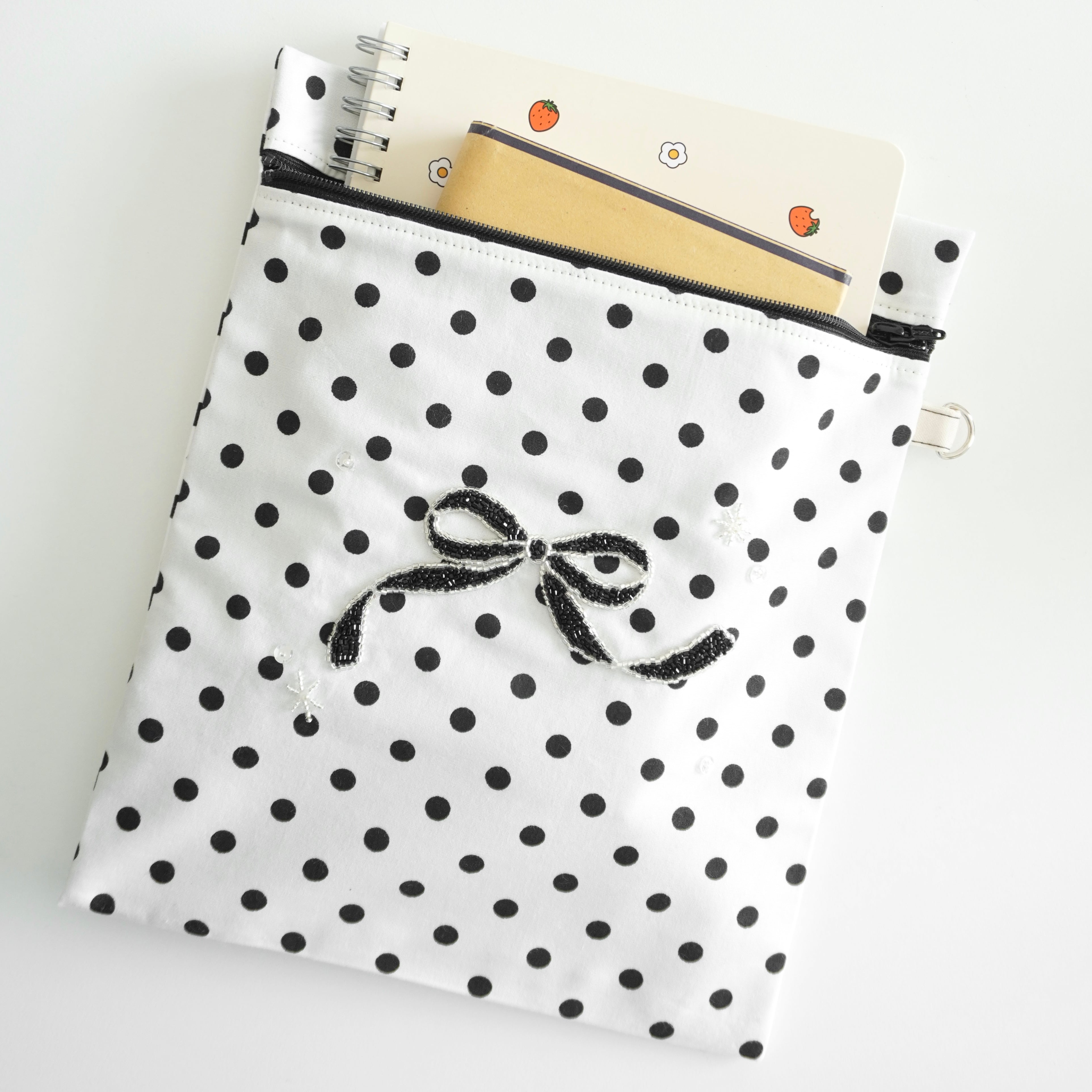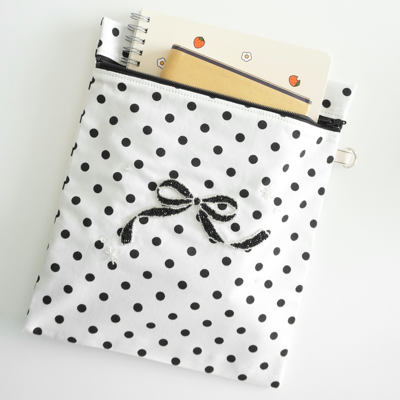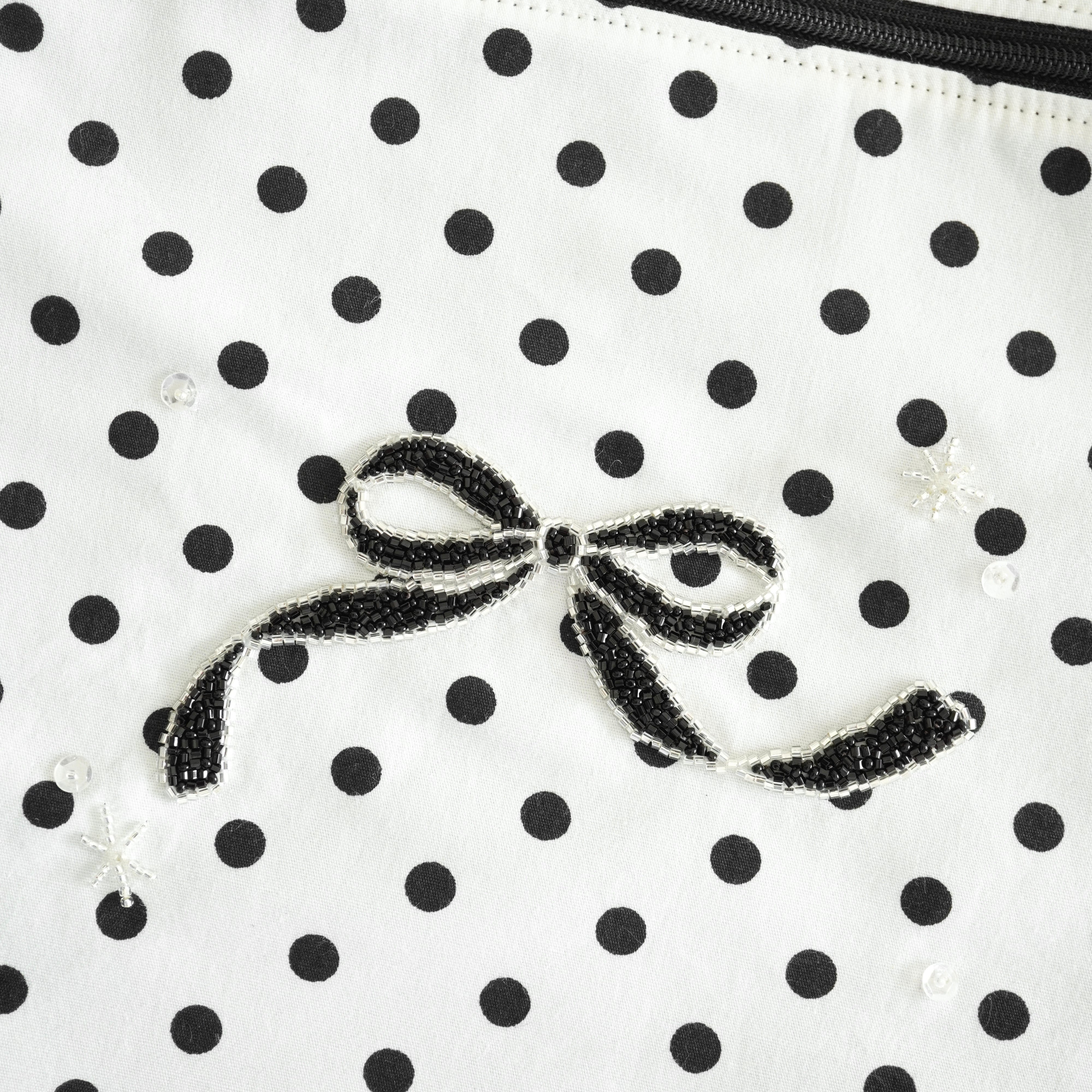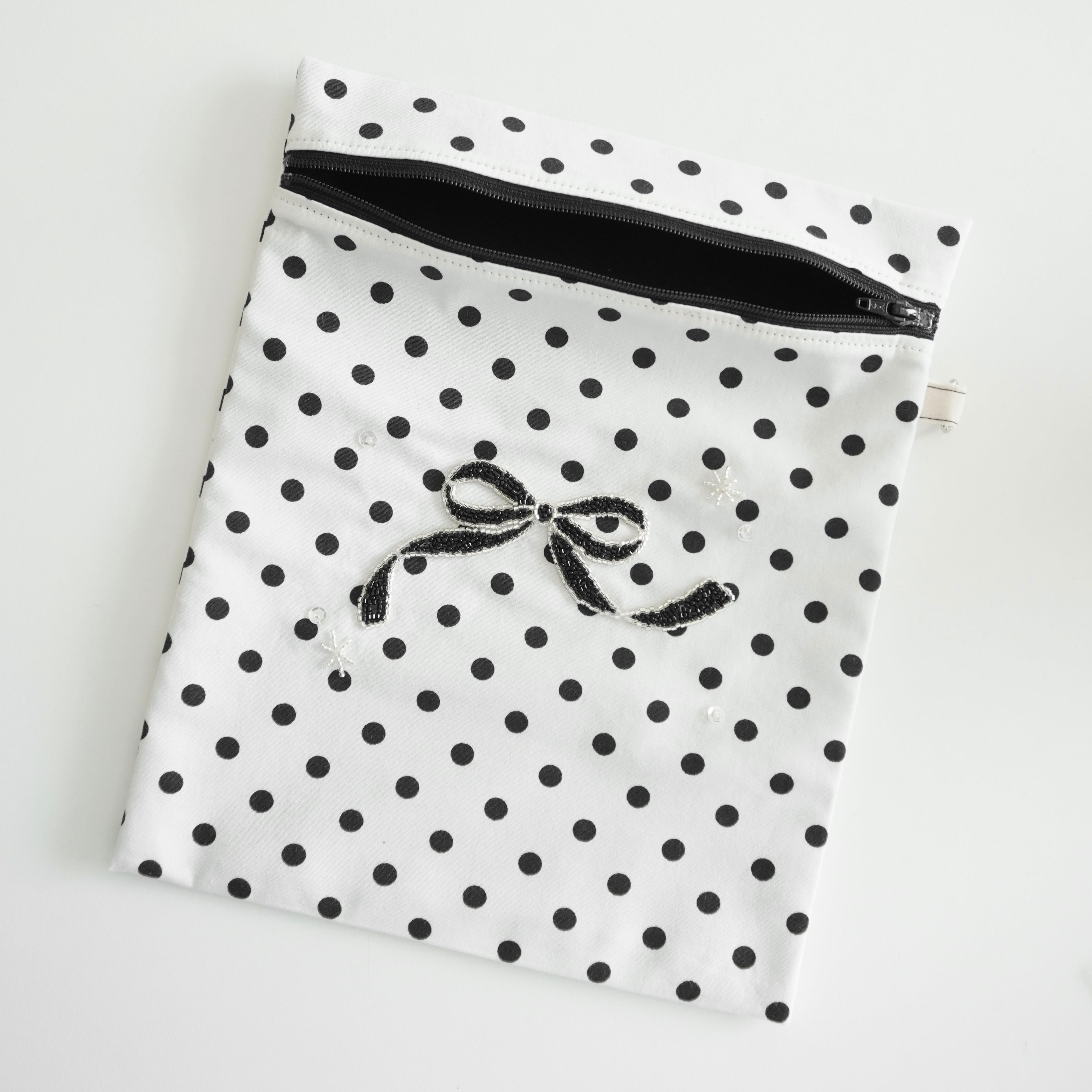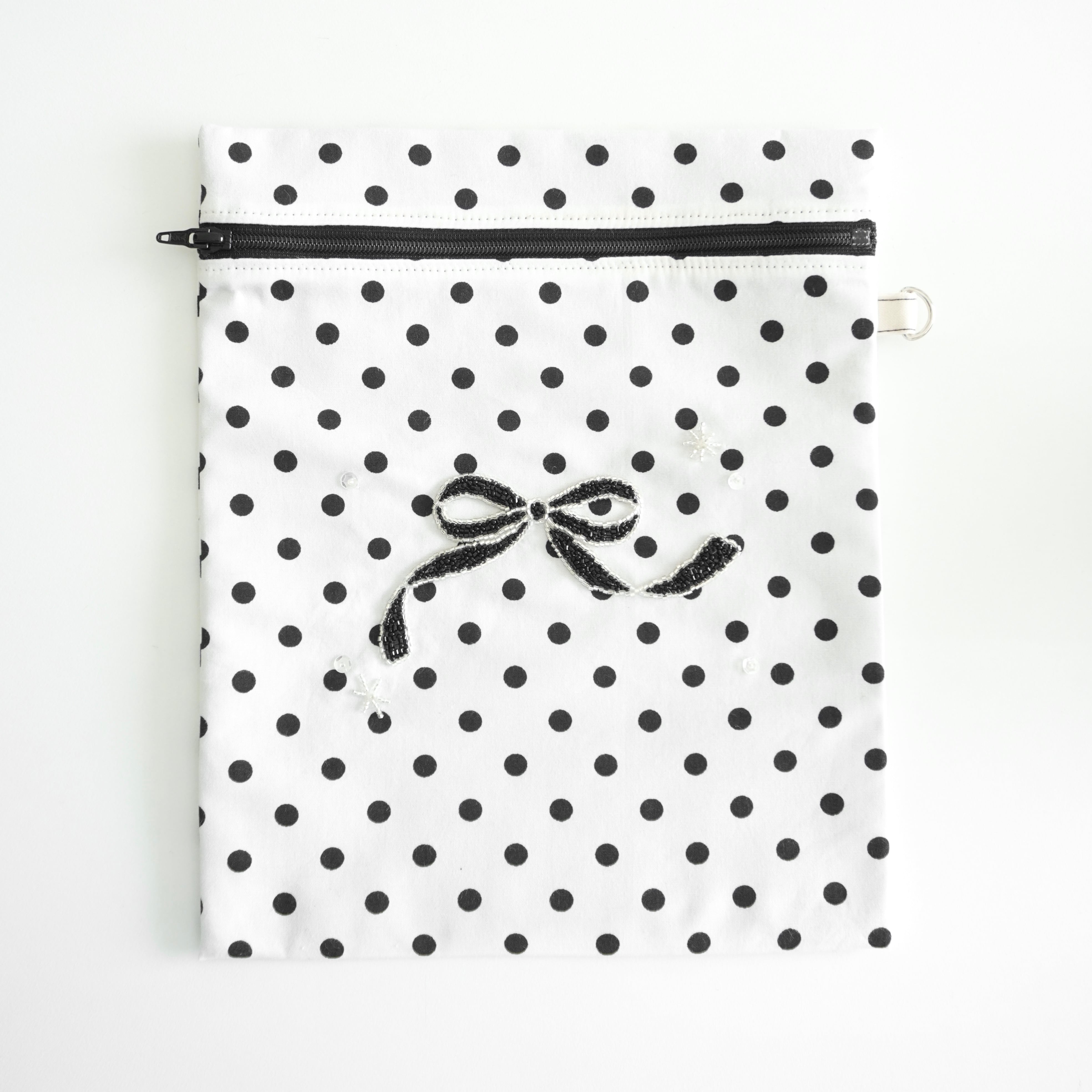 白地に黒のドット柄がポップなファスナー付きのフラットポーチです。