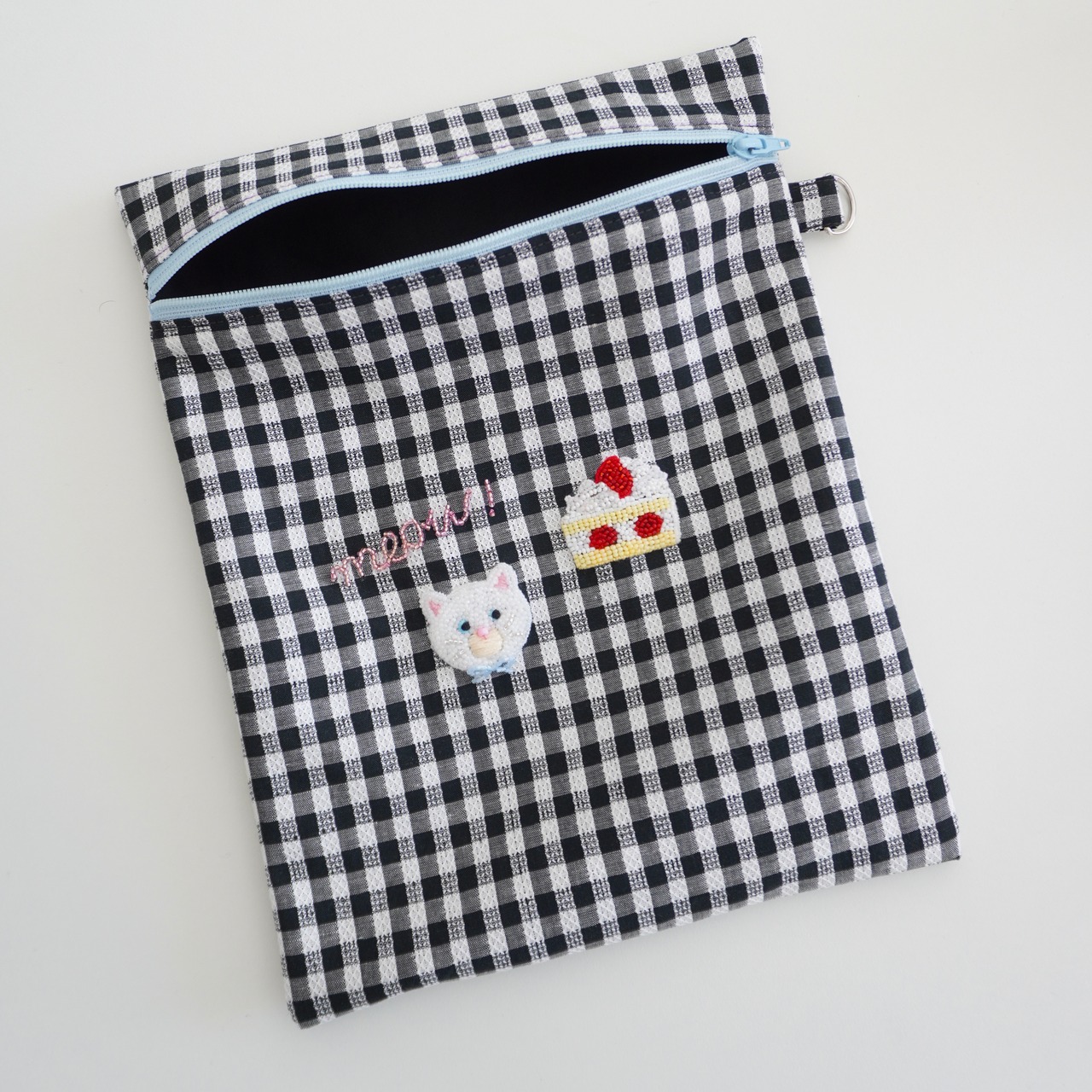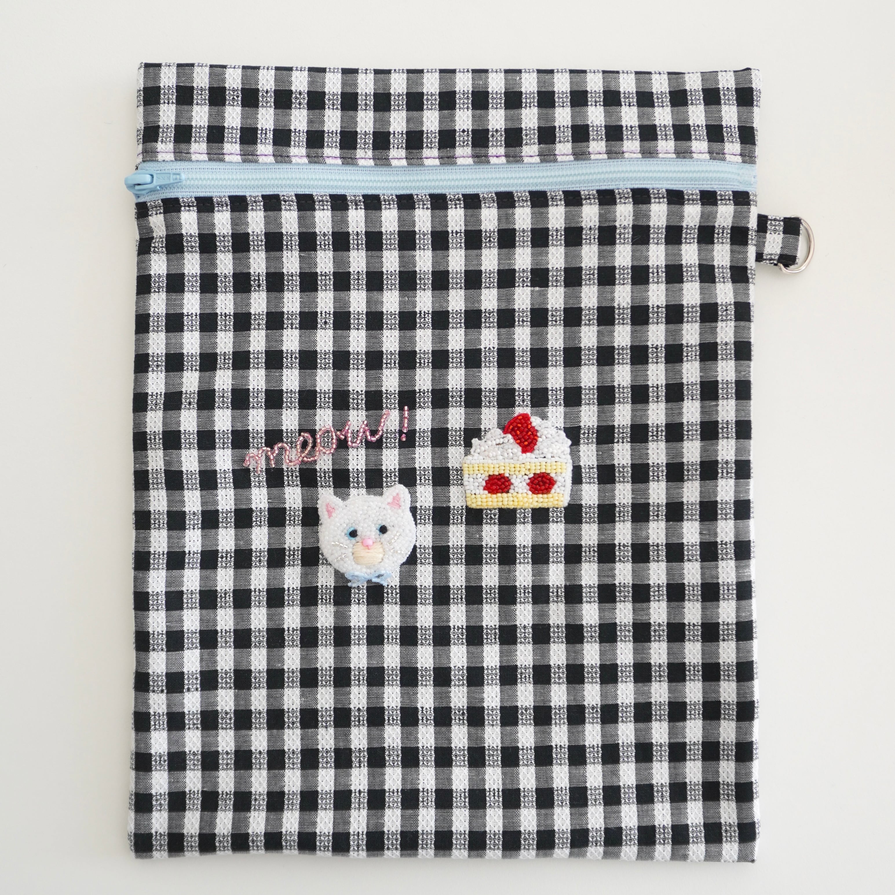 コピー:ビーズ刺繍の猫とショーケーキのファスナーフラットポーチ(白黒ギンガムチェック)