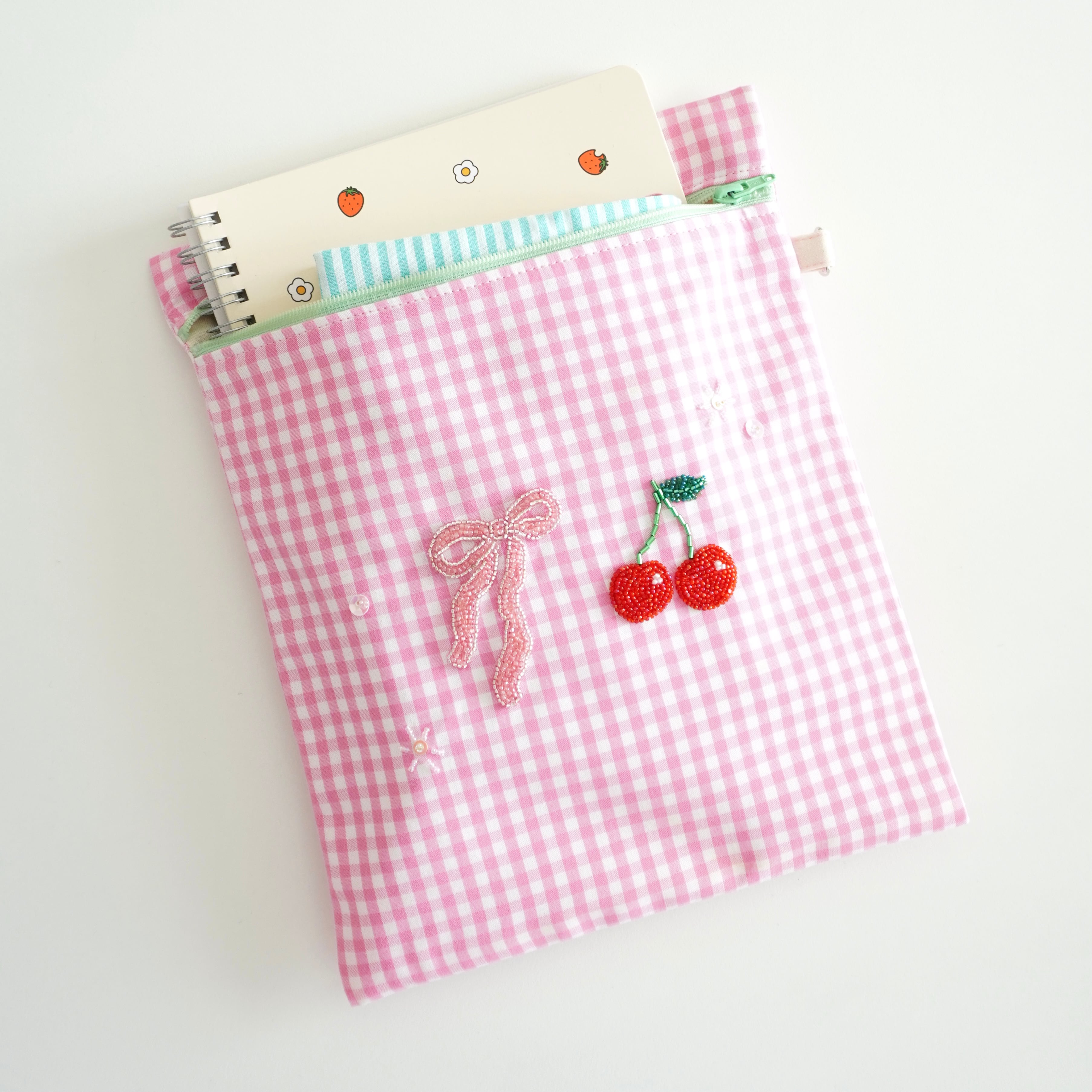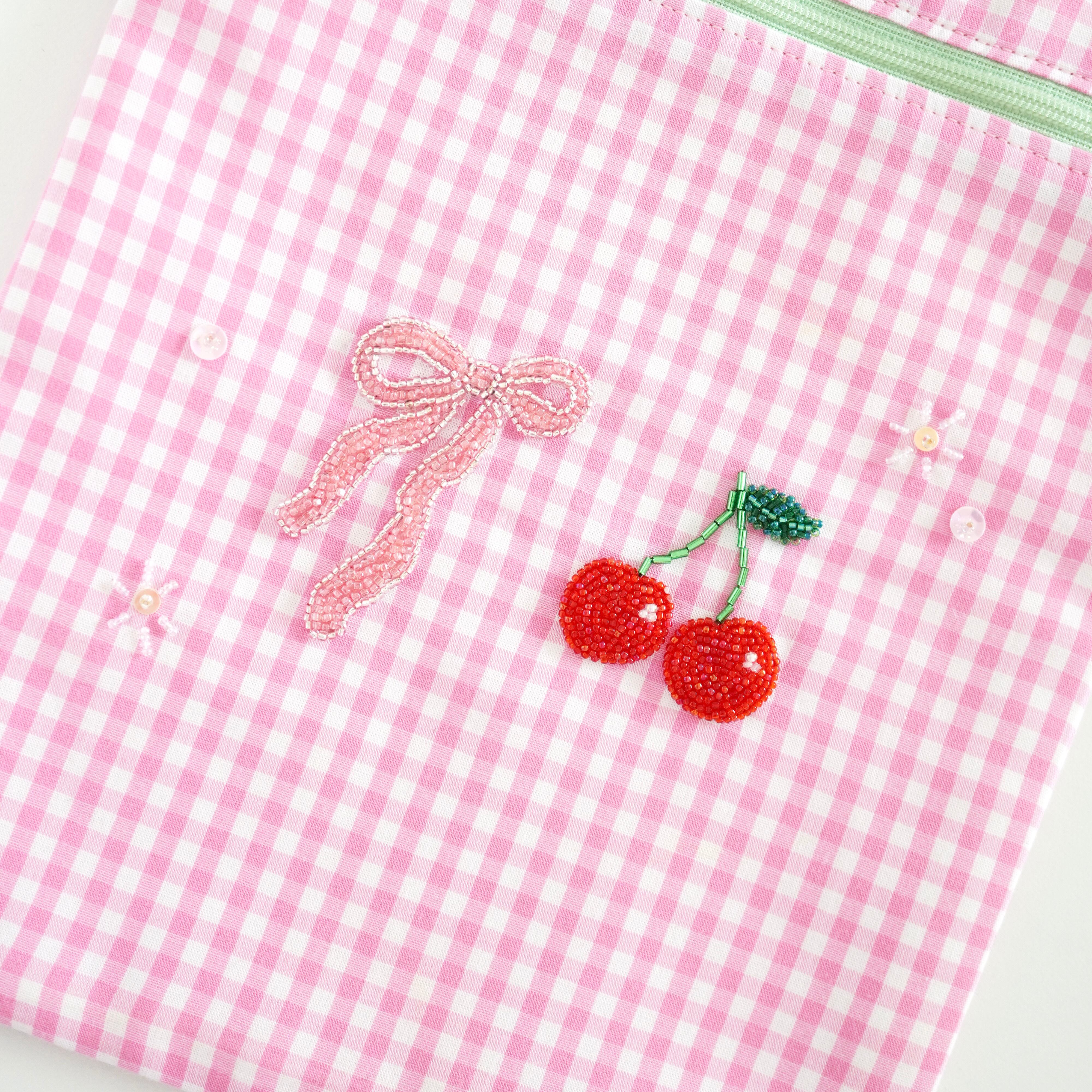 \特別価格/ ビーズ刺繍のさくらんぼとリボンのファスナーフラットポーチ(ピンクギンガムチェック)