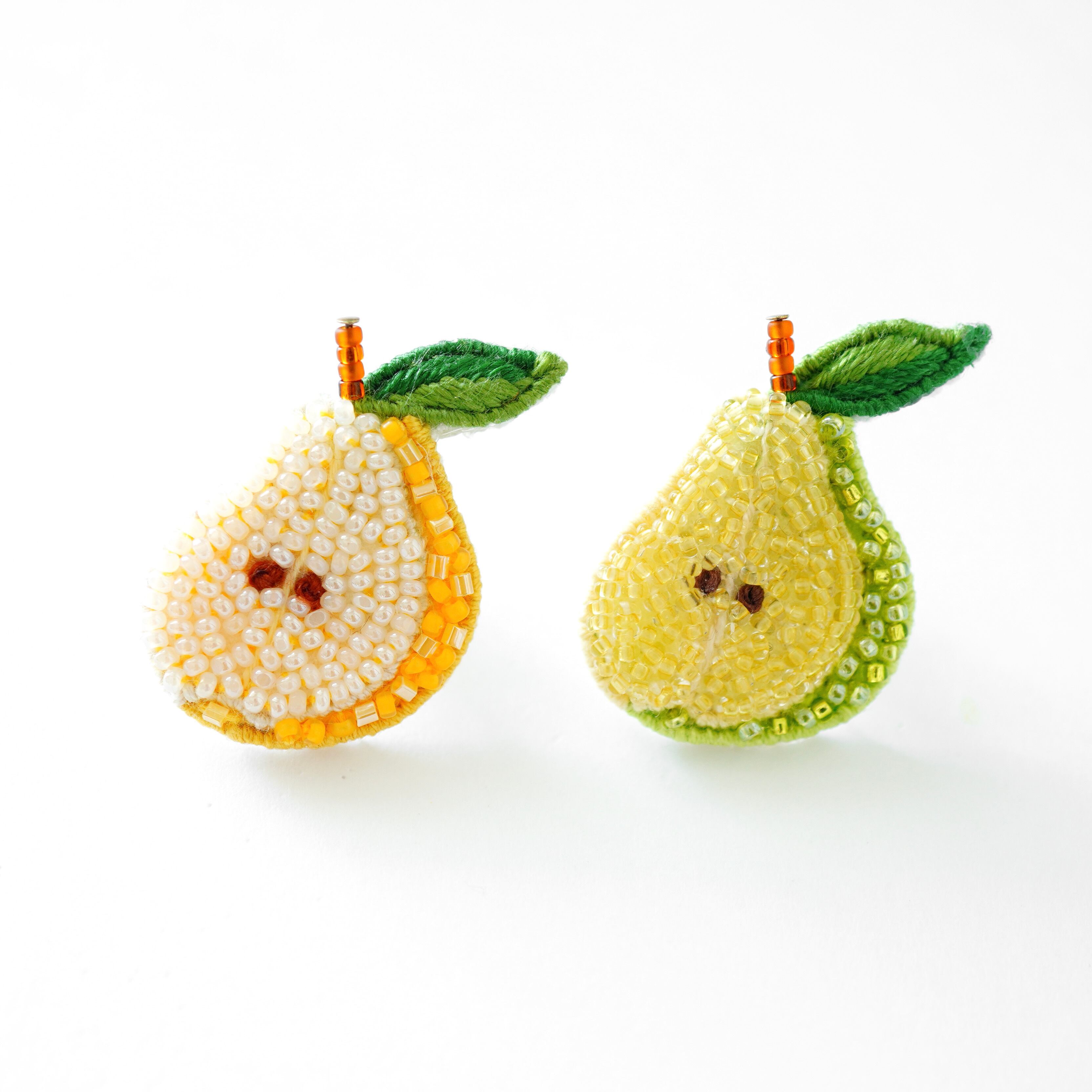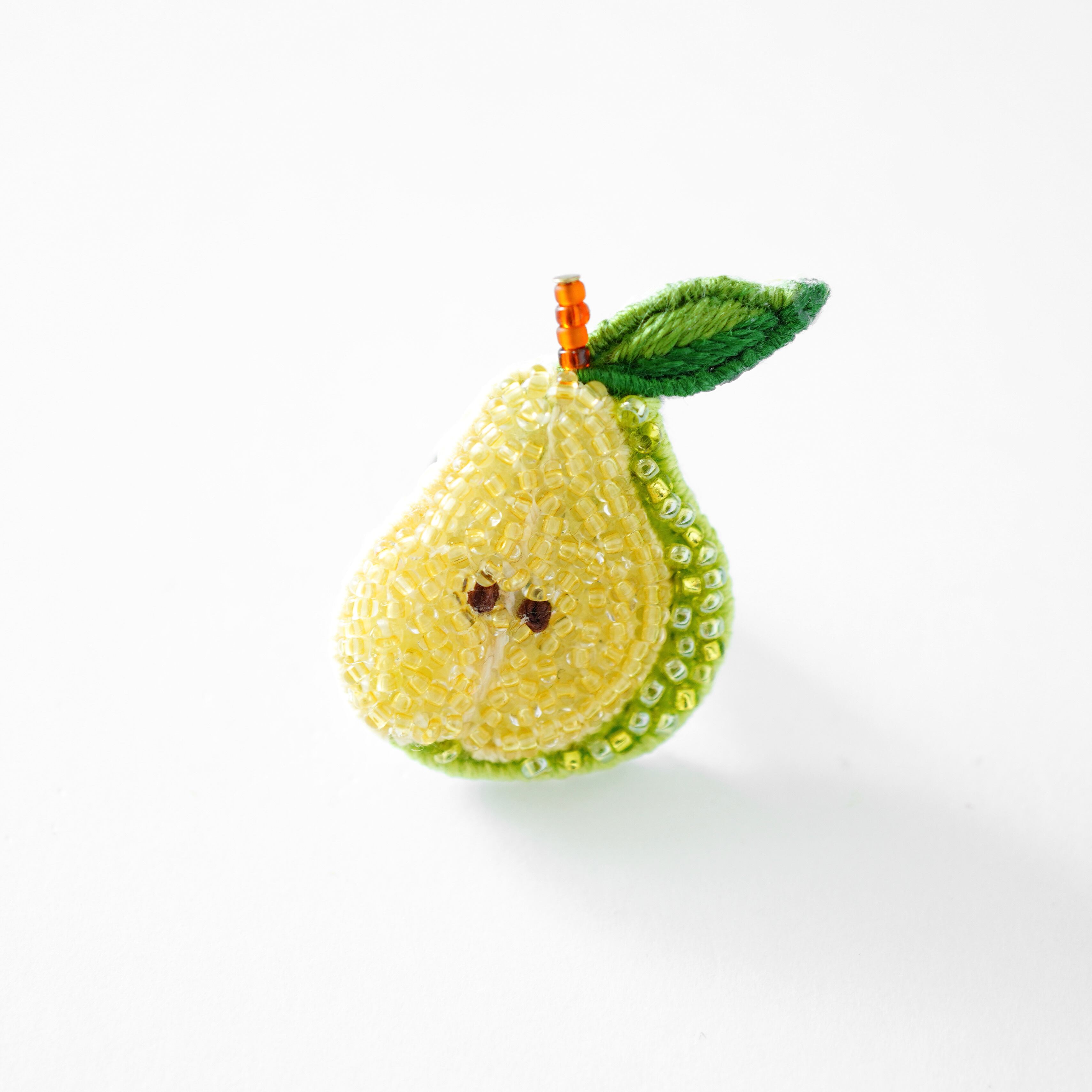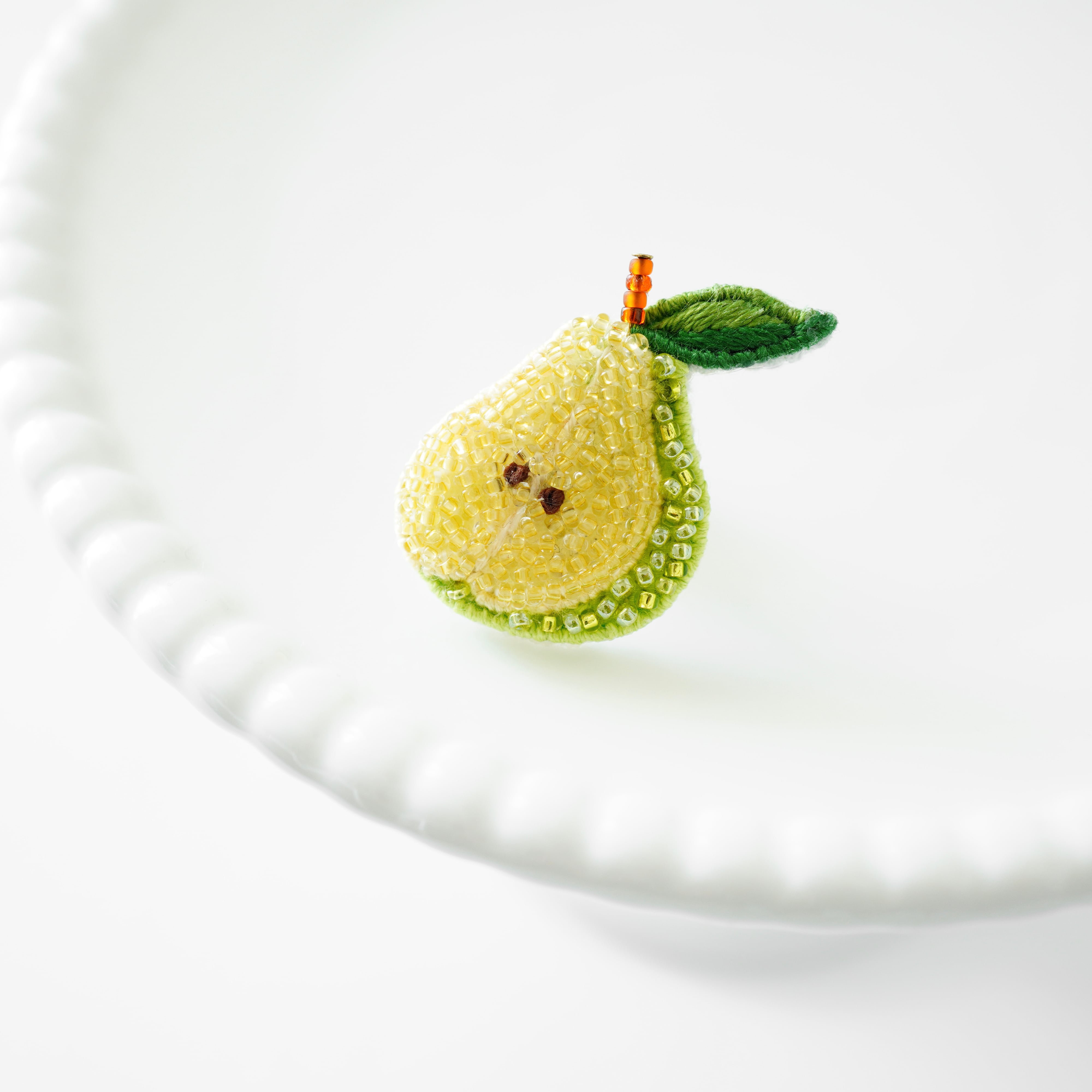 洋梨のまるまるとしたフォルムとジューシーな果肉をビーズ刺繍で表現したピンバッジです。