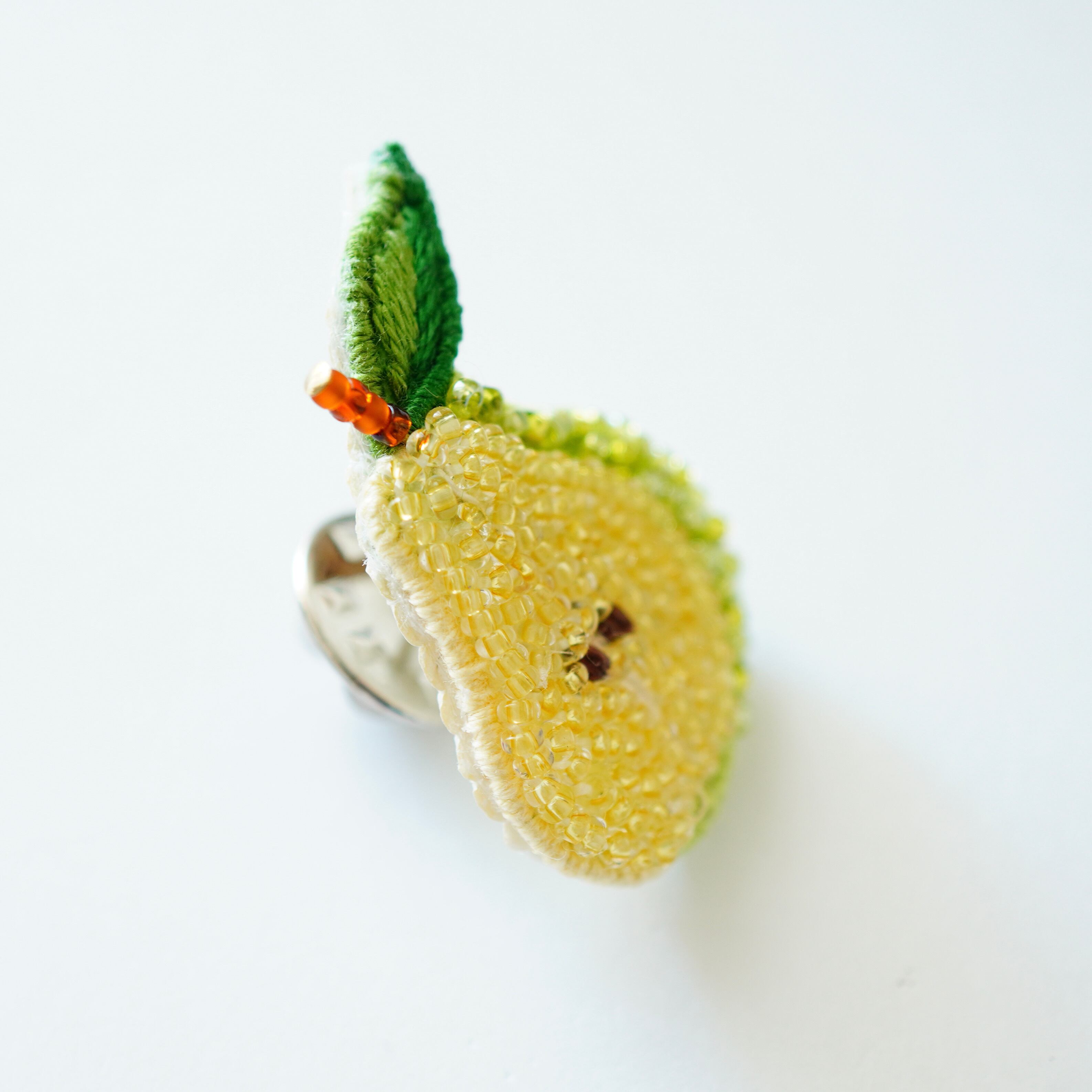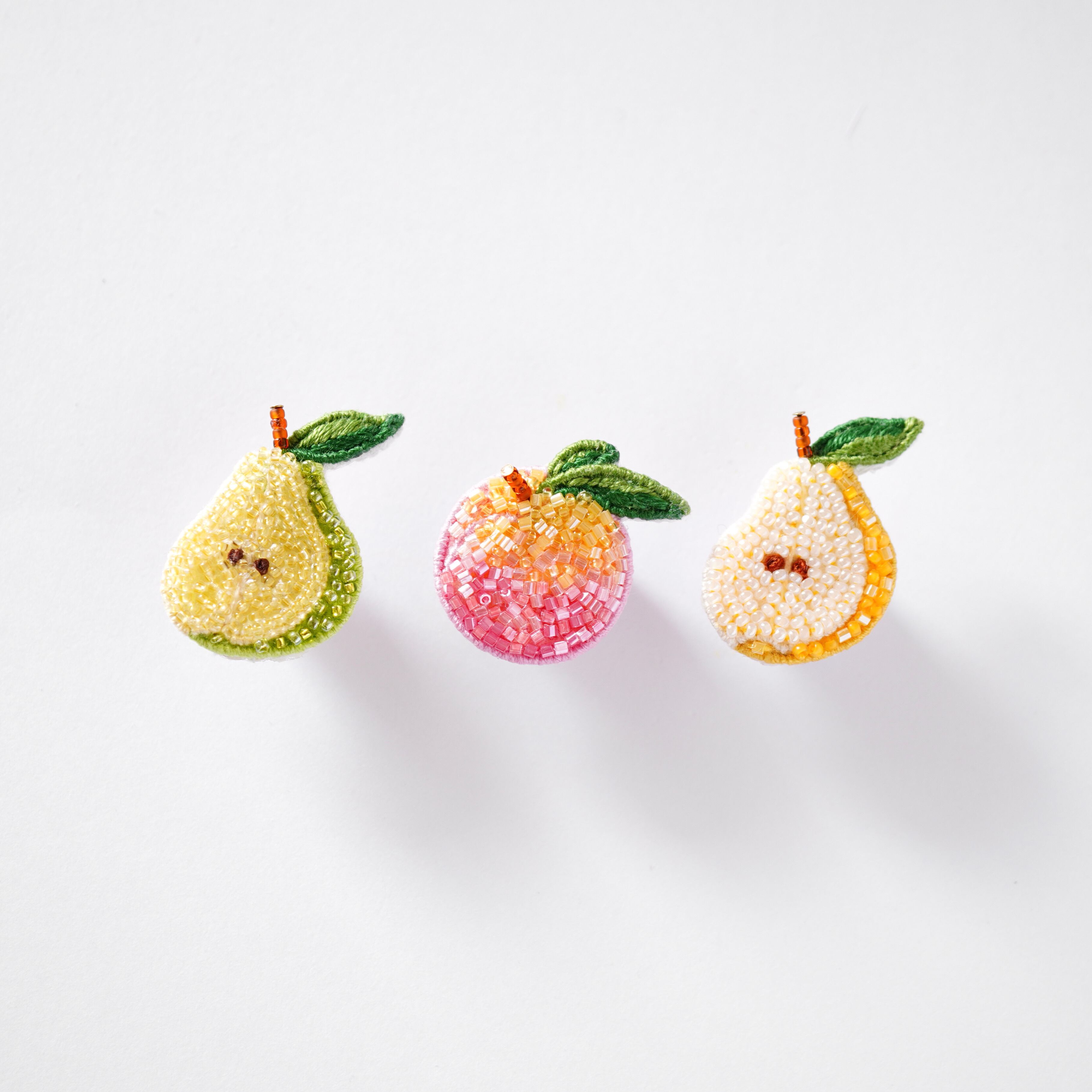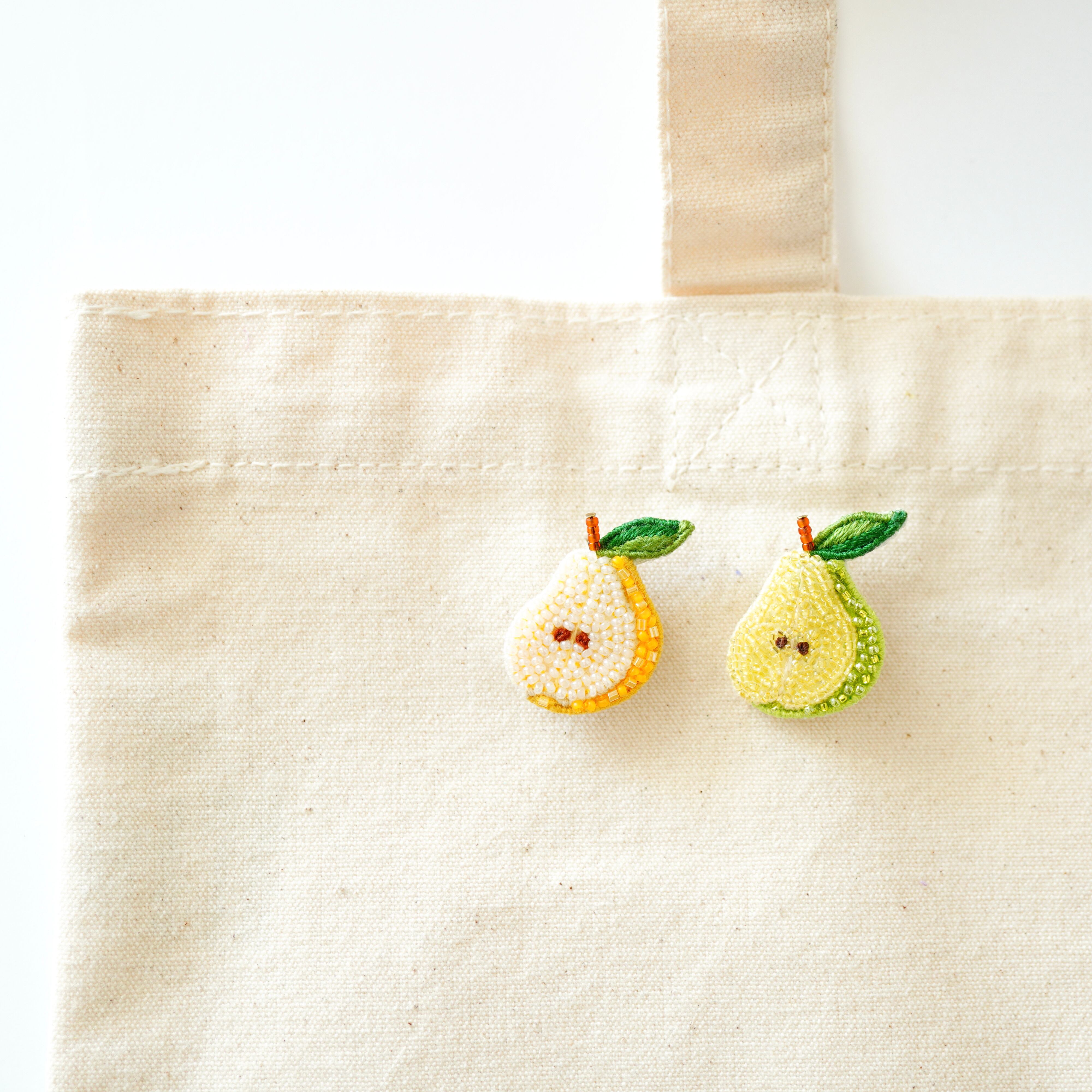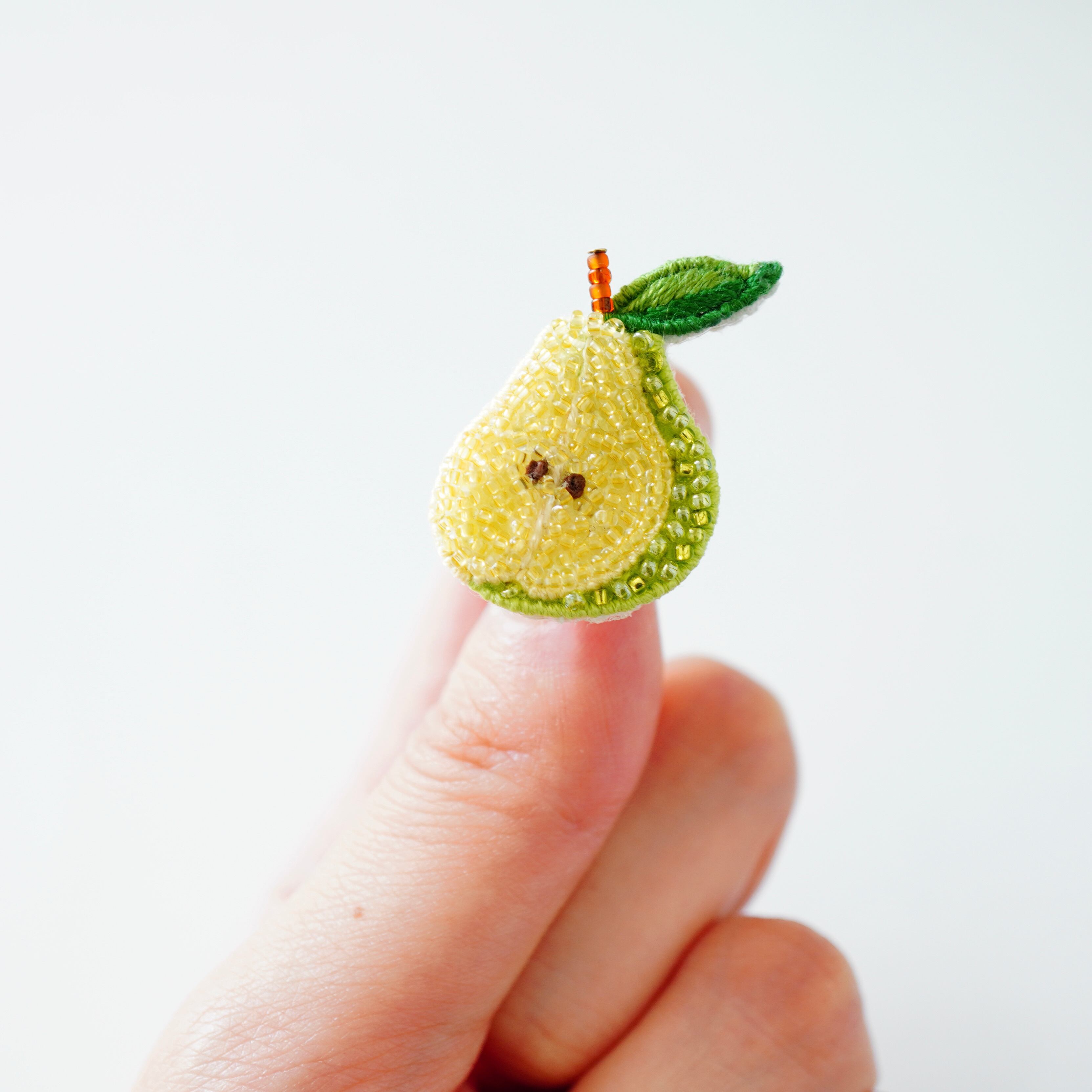 洋梨のまるまるとしたフォルムとジューシーな果肉をビーズ刺繍で表現したピンバッジです。
