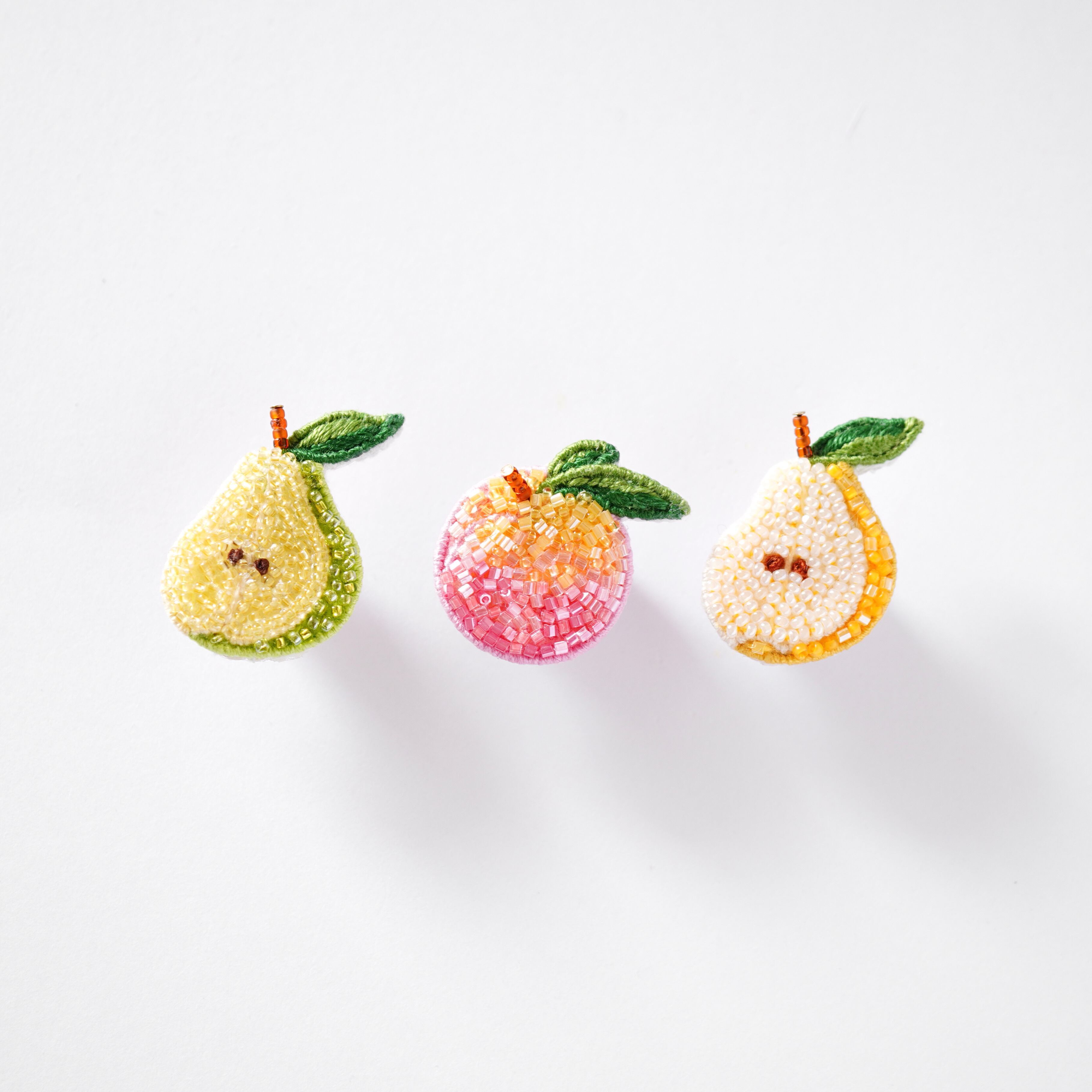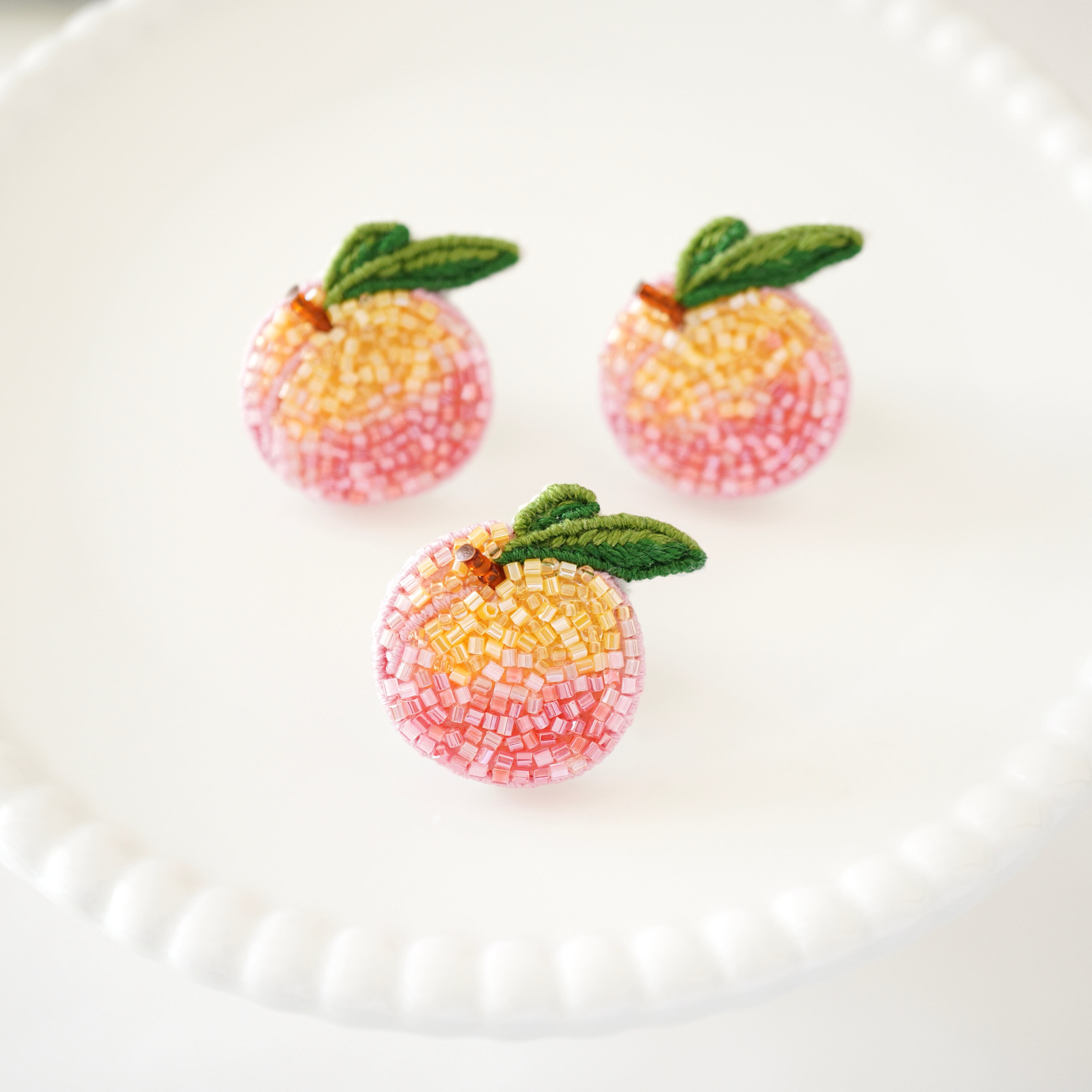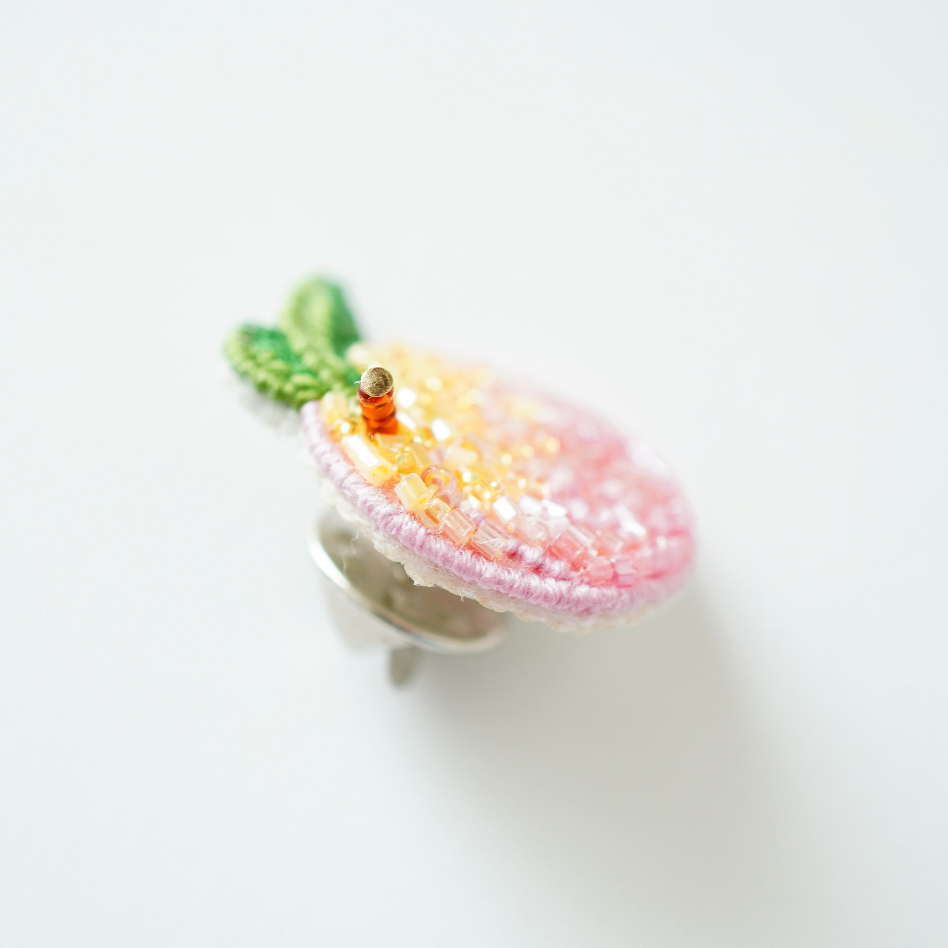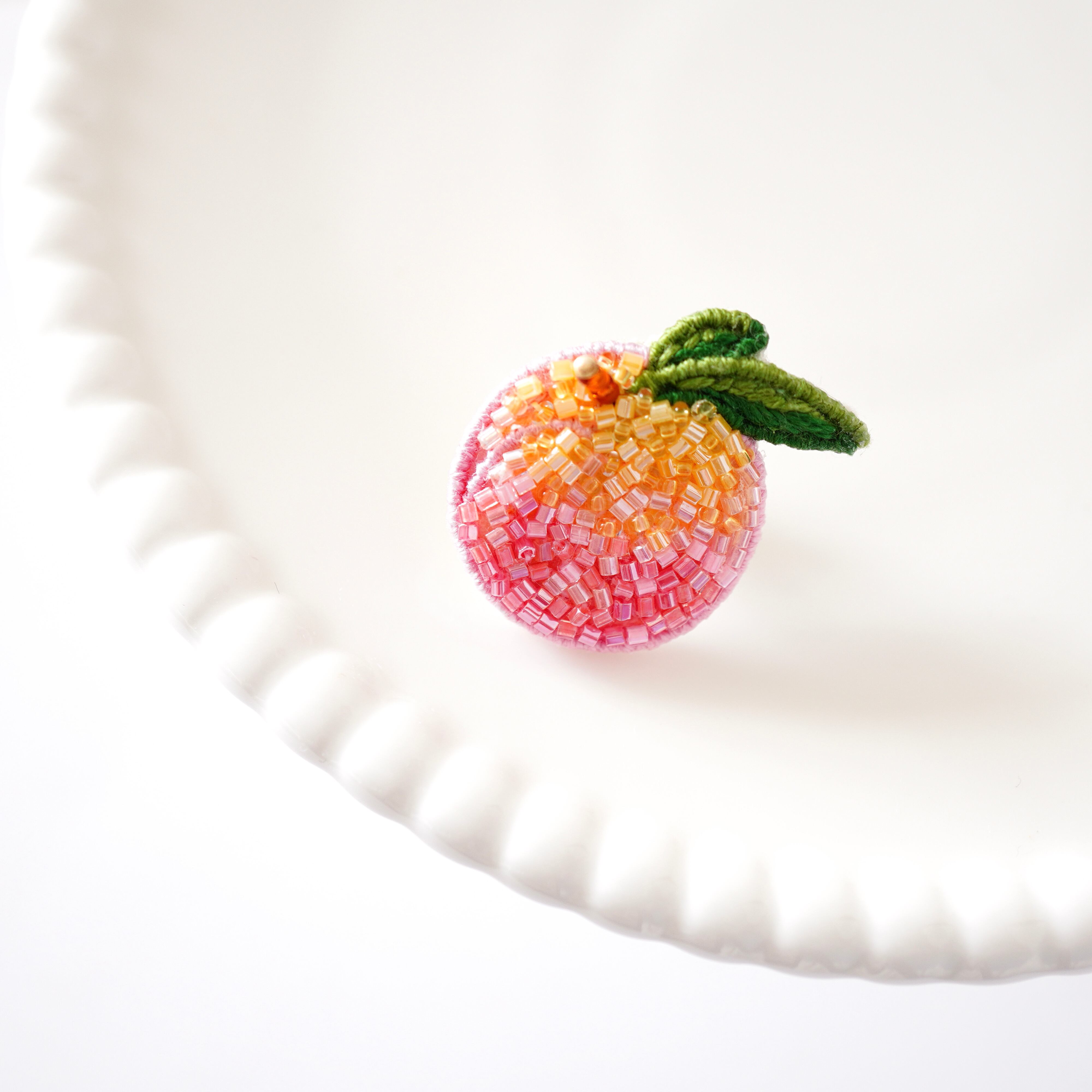 シャーロットビーズや六角ビーズなどカットの入ったビーズを使用しているため、光が当たるとキラキラと輝きます。艶々とした質感が、果汁たっぷりの甘く瑞々しい桃のイメージにぴったりです。