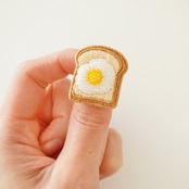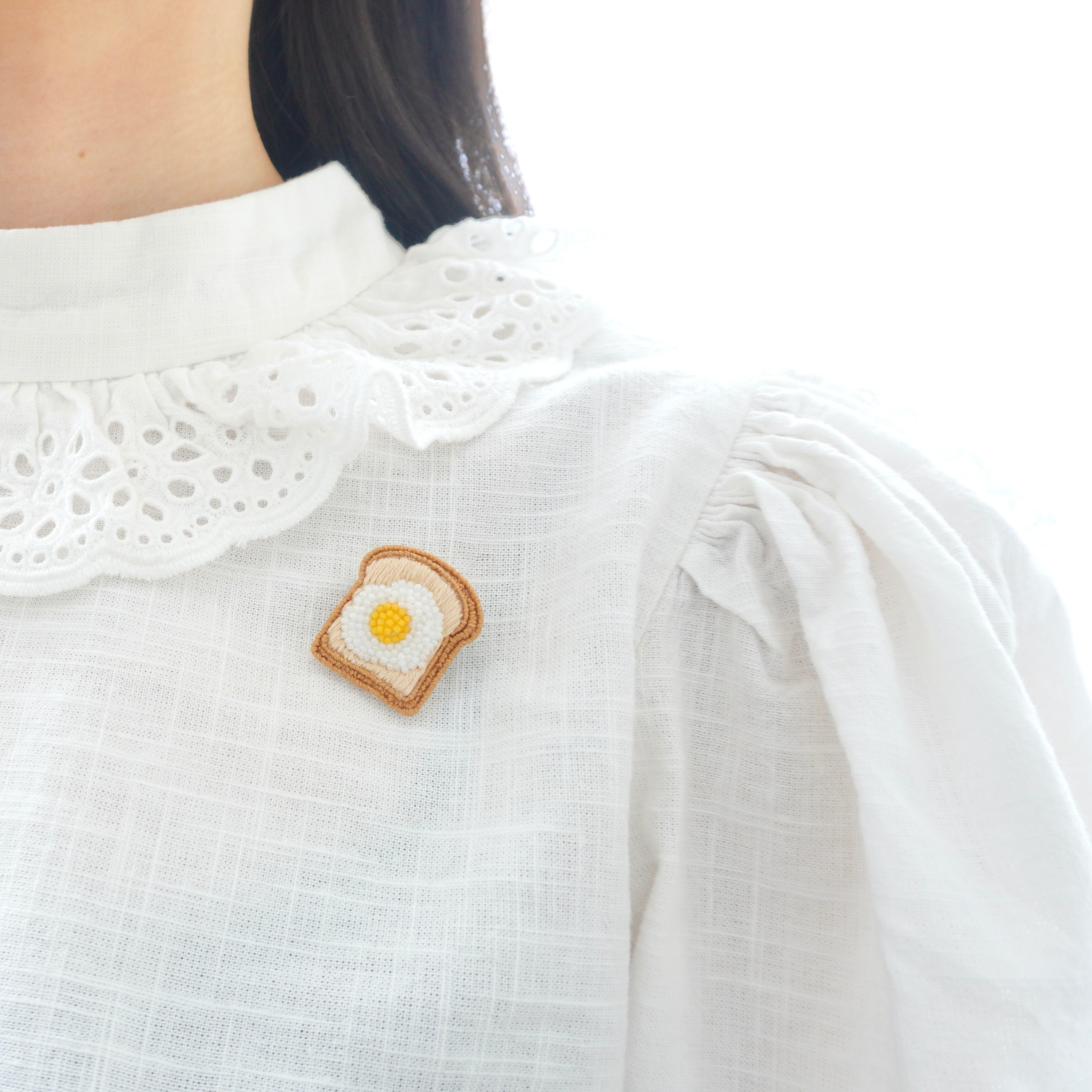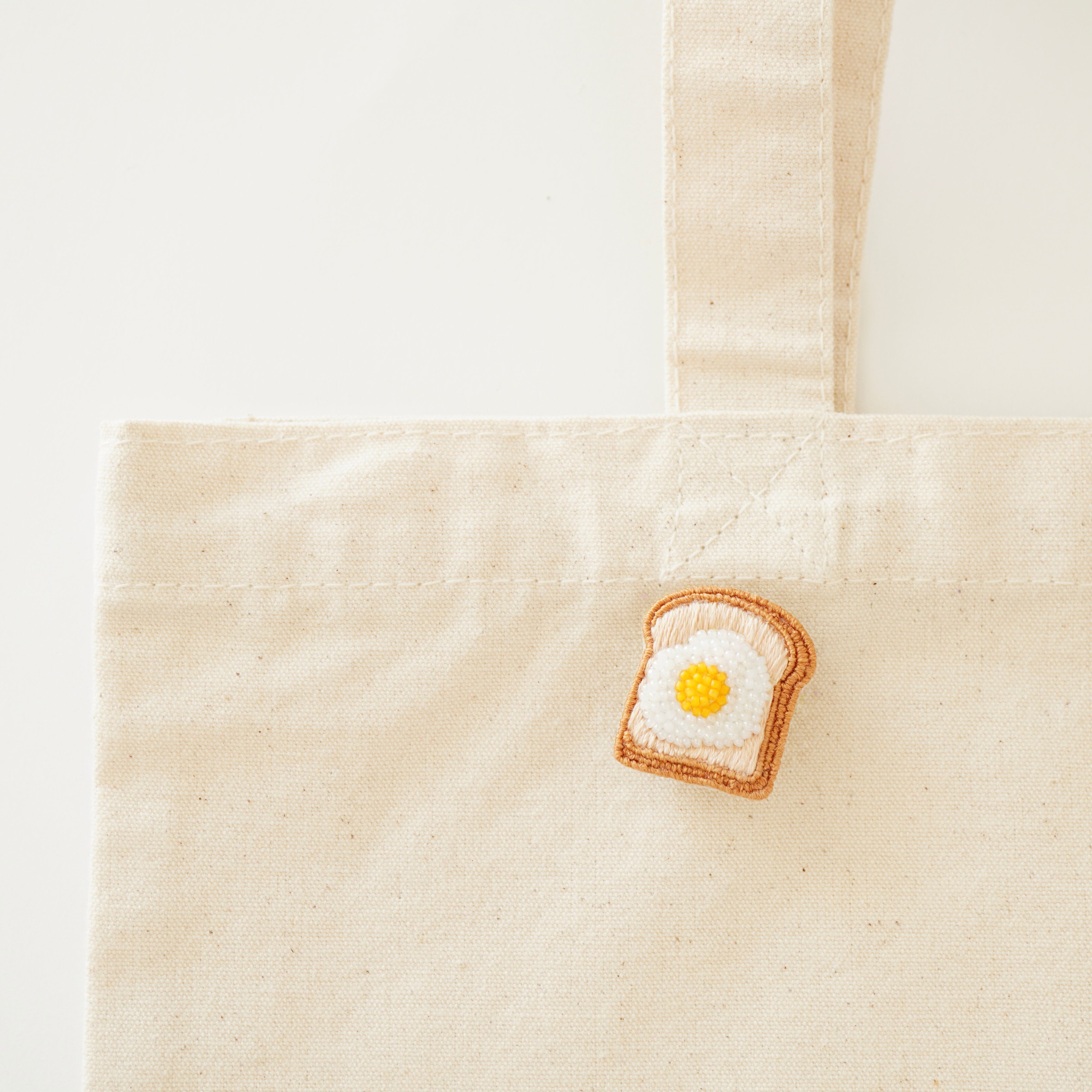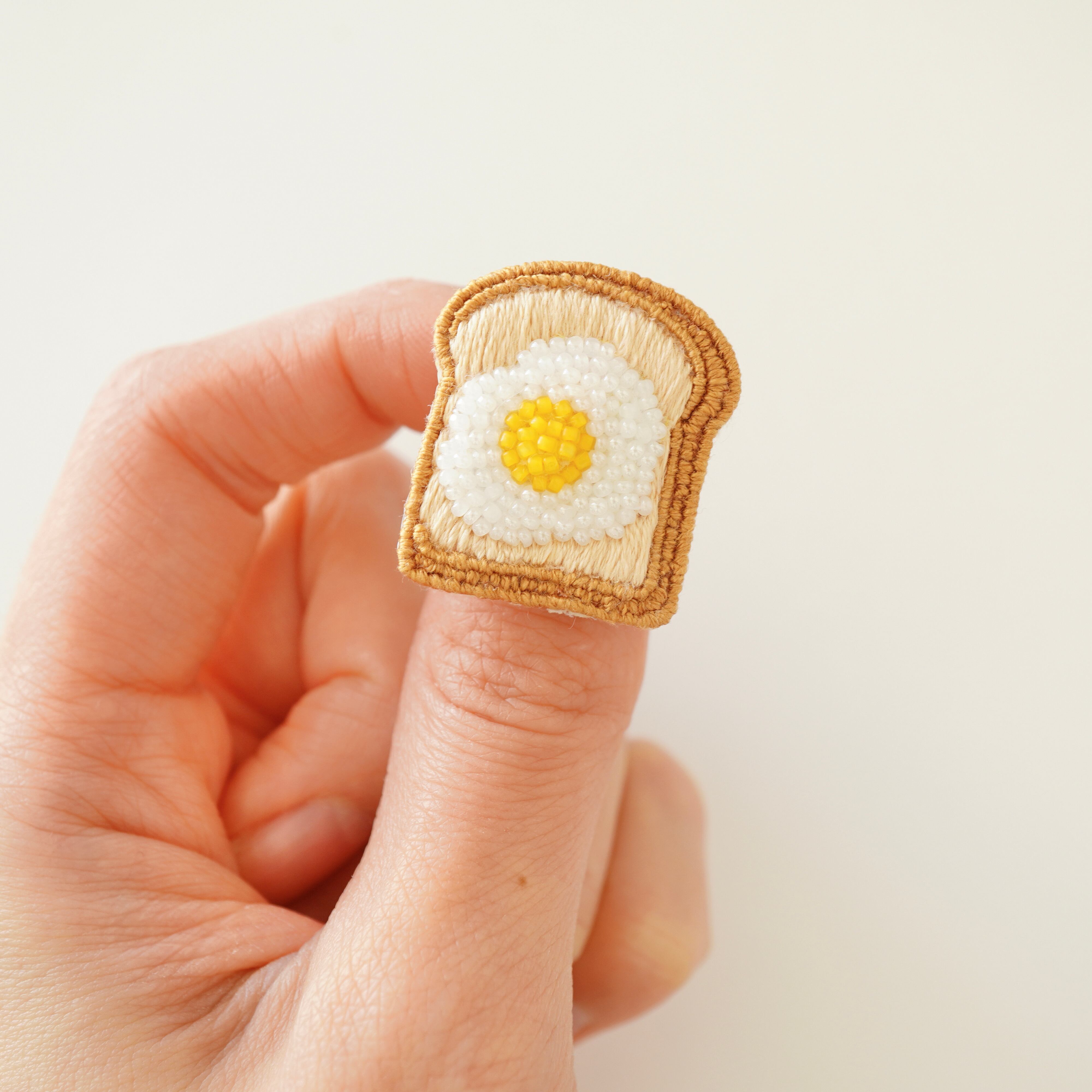 トースト部分は刺繍糸でふわふわとしたパンの質感を表現し、卵の部分はビーズで刺繍しました。
