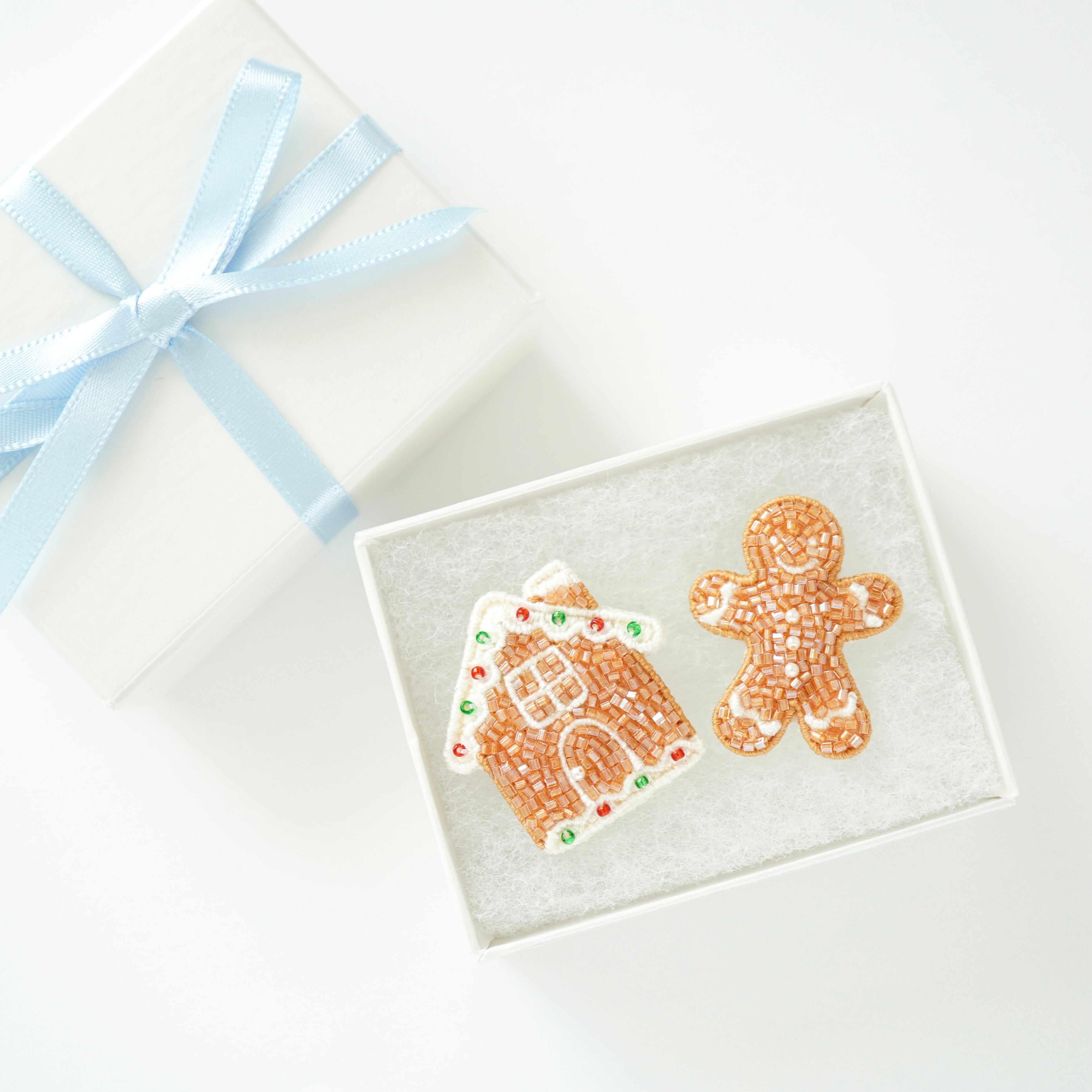 ビーズ刺繍で制作したジンジャーブレッドクッキーのブローチセットです。
